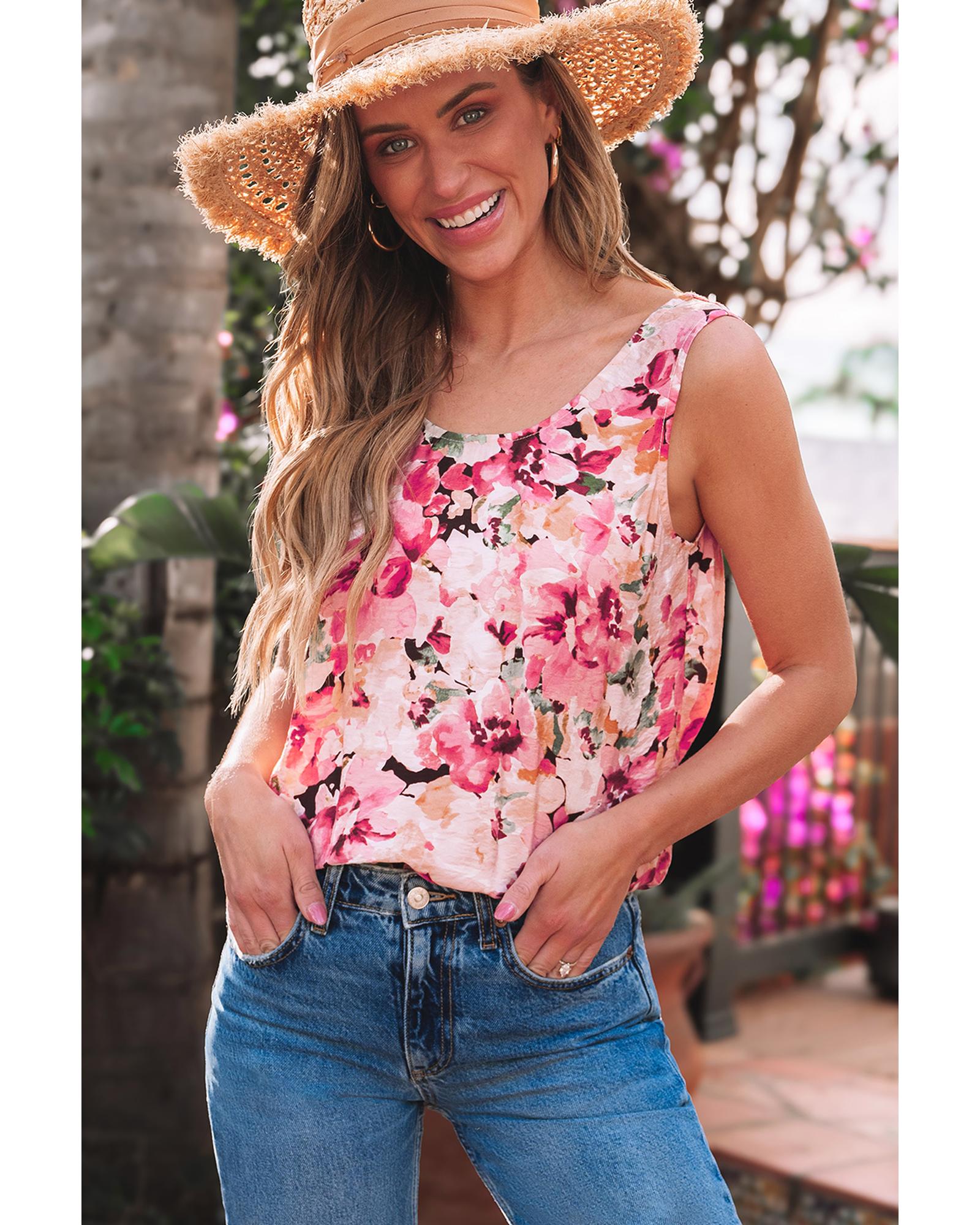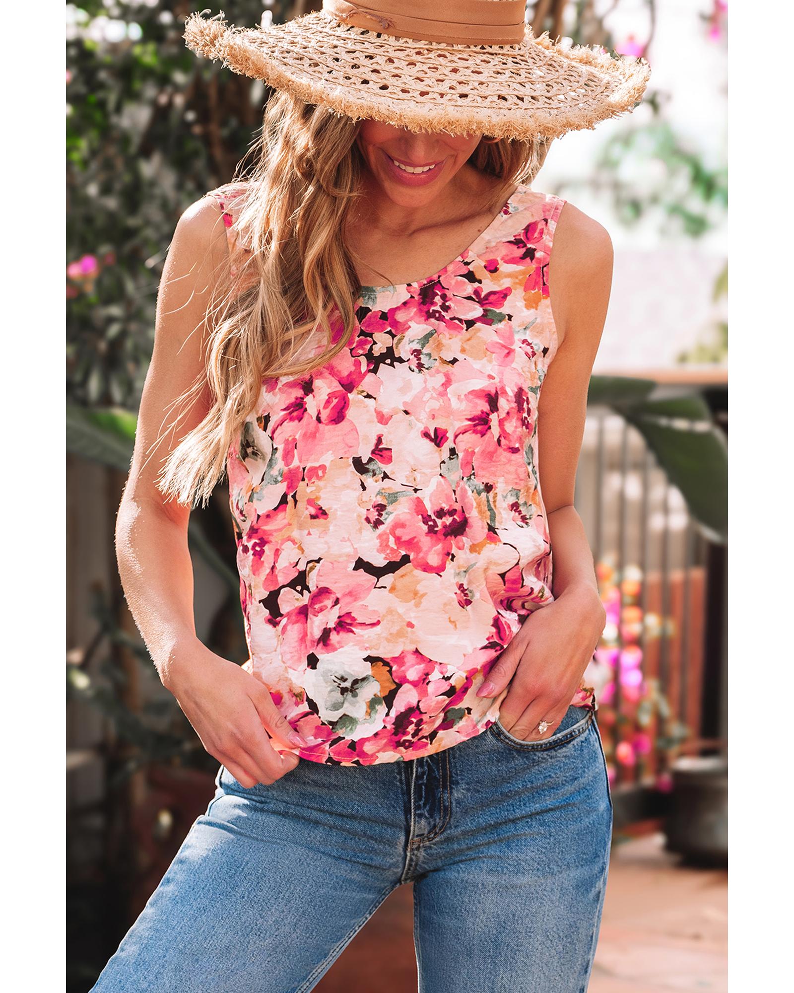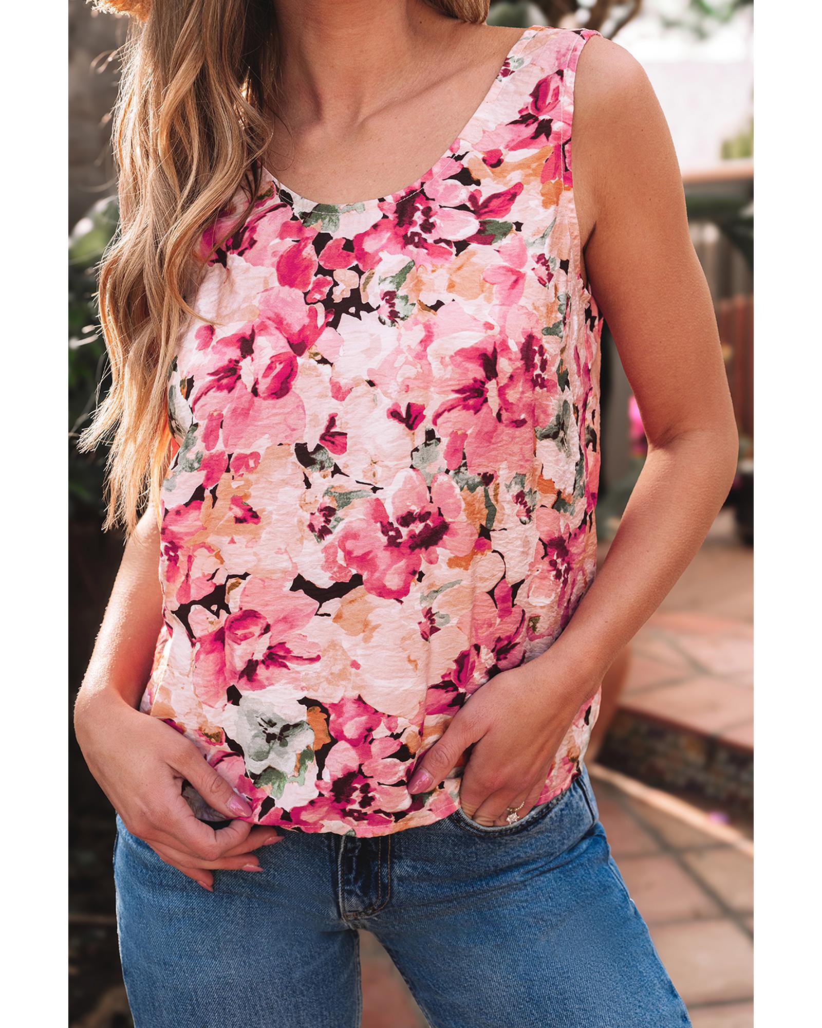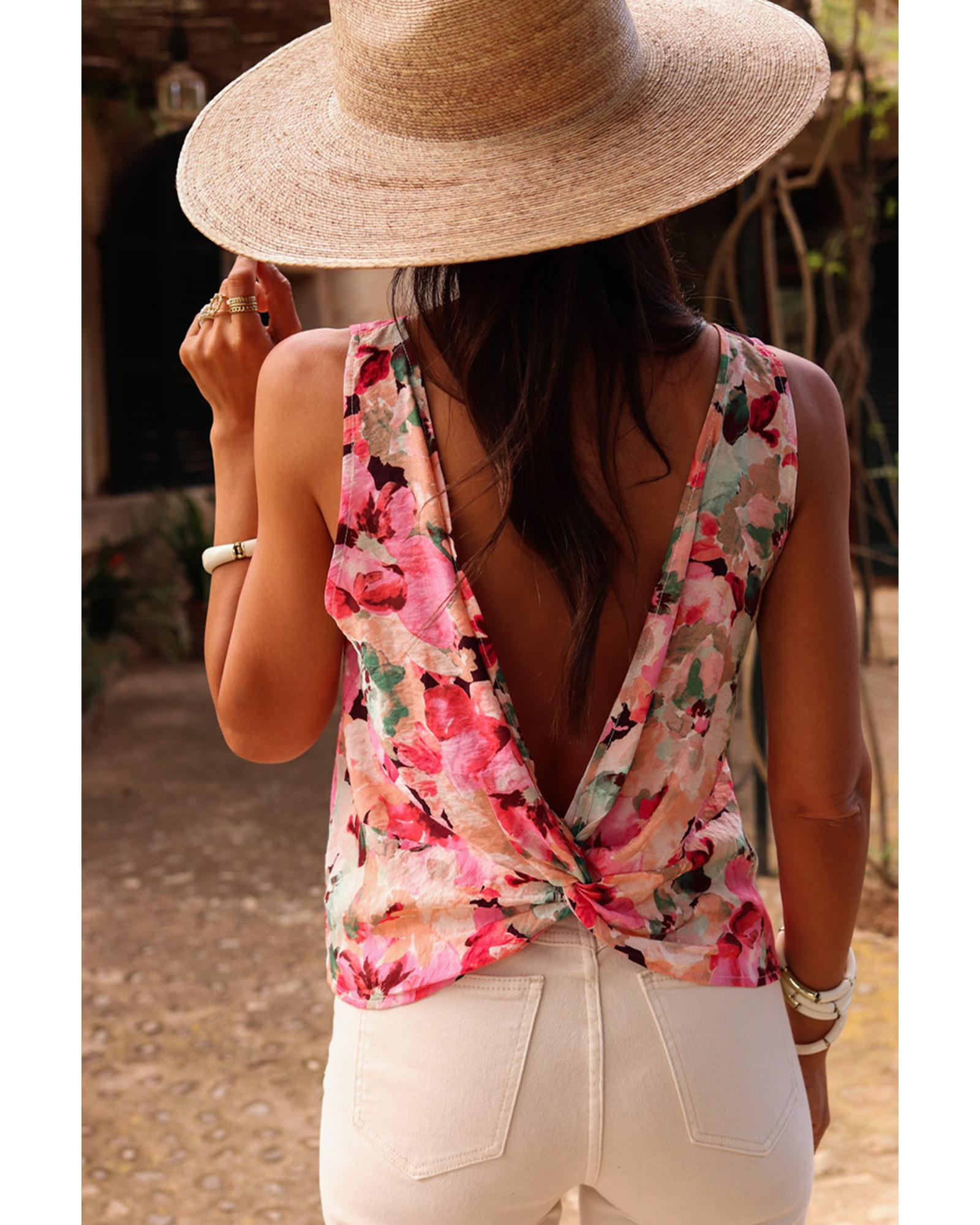 Pink Floral Round Neck Twisted Cut Out Back Tank Top – S