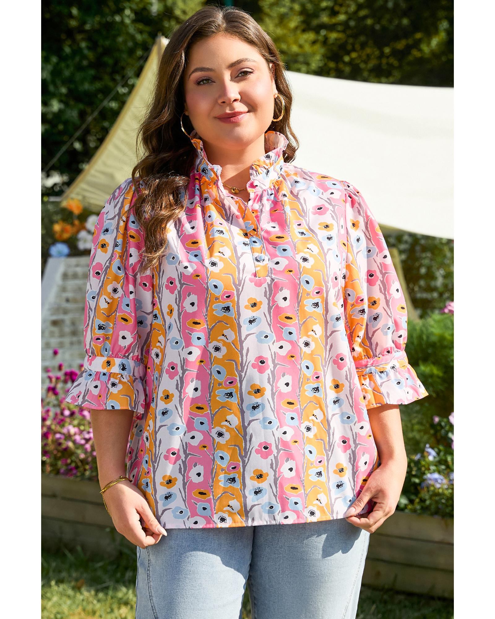 Pink Floral Ruffled Collar Bracelet Sleeve Plus Size Blouse Top – 3X