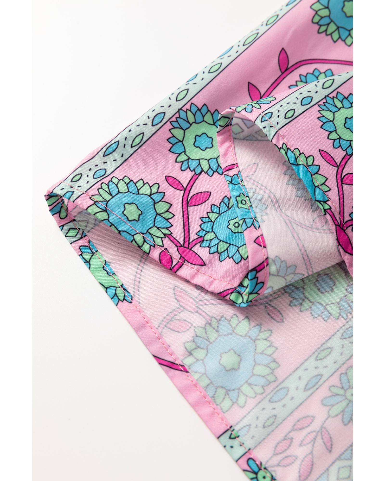 Pink Floral Shirred Puff Sleeve Buttoned Front Midi Dress with Sash – L