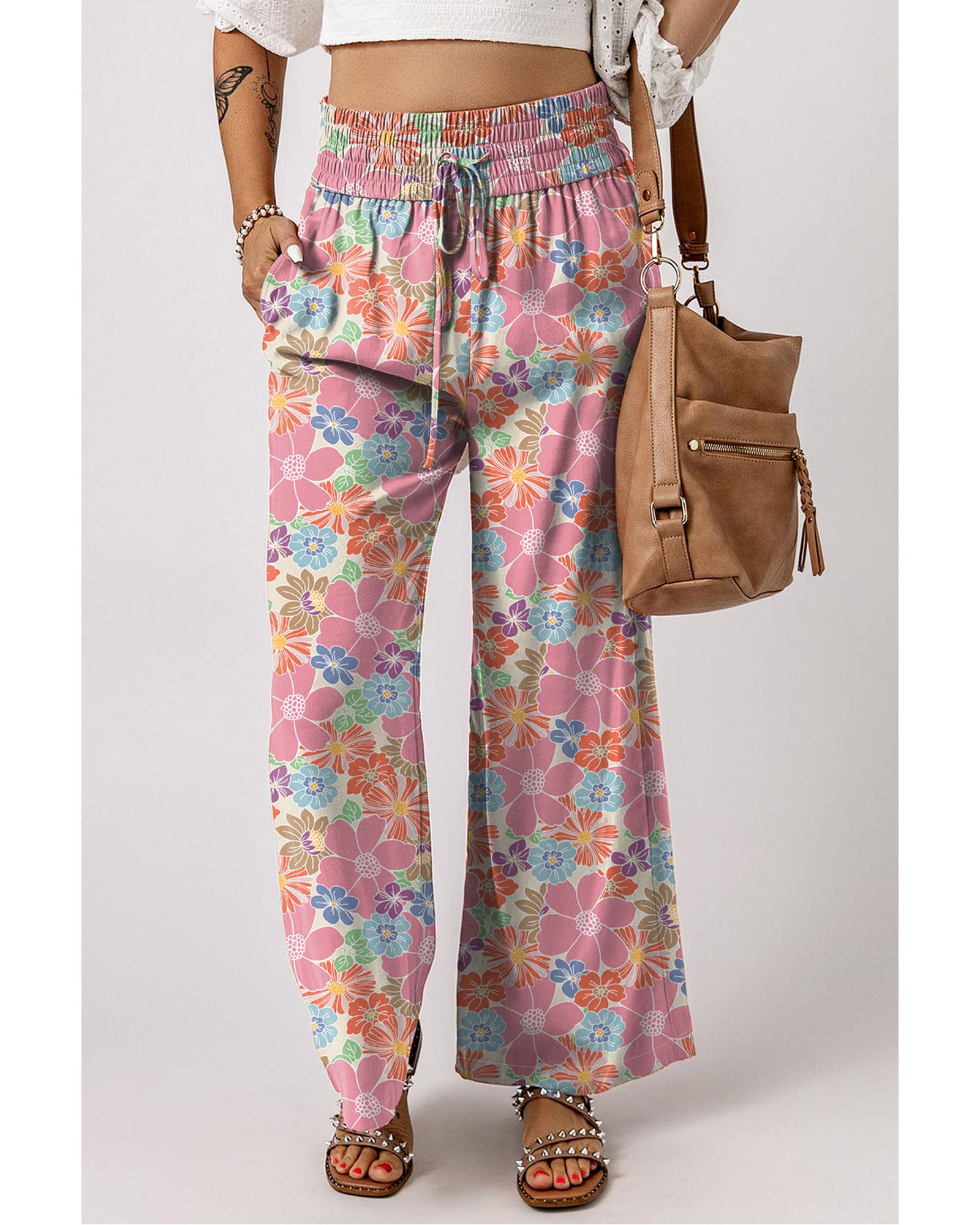 Pink Floral Smocked Waist Loose Pants – S