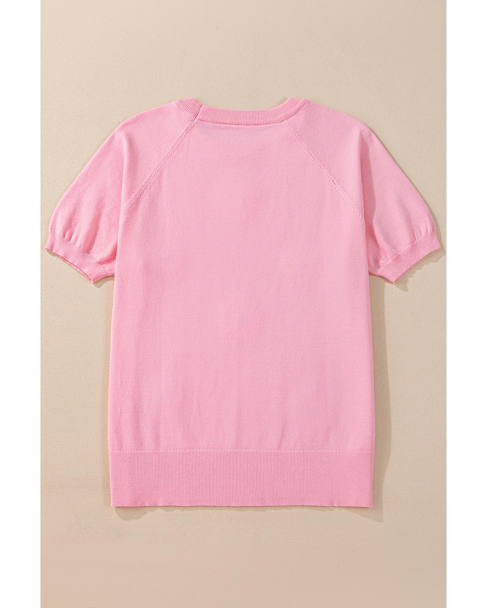 Pink Flower Pattern Short Sleeve Knitted Top – S
