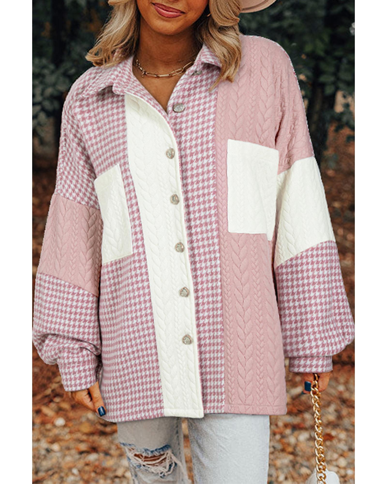 Pink Houndstooth Color Contrast Textured Patchwork Loose Shacket – XL