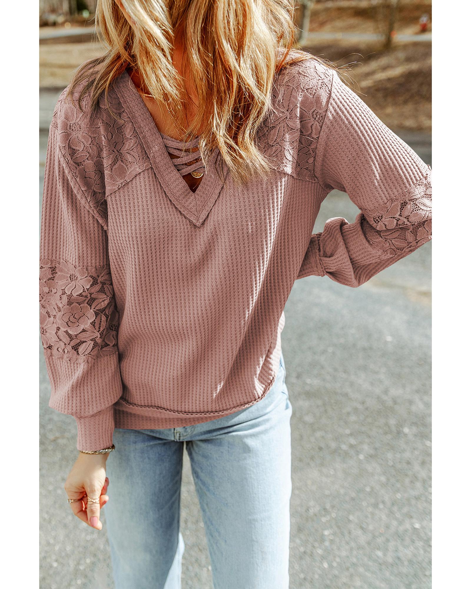 - Pink Lace Waffle Patchwork Strappy V Neck Long Sleeve Top