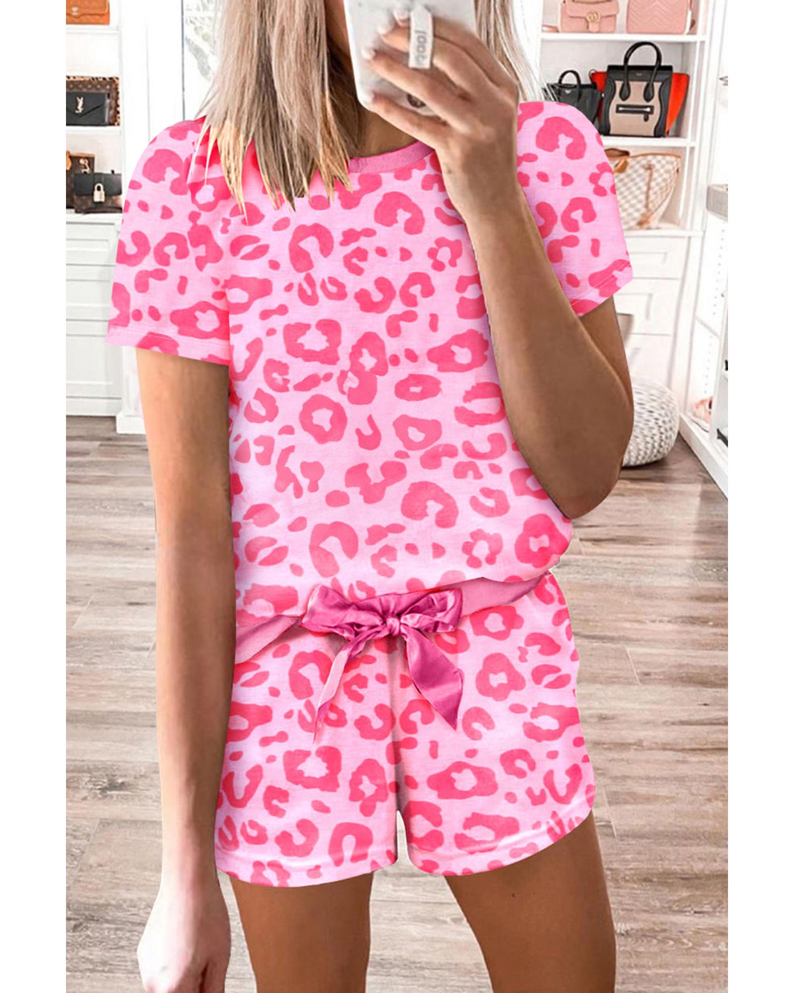 - Pink Leopard Print Tee and Satin Tie Shorts Lounge Set