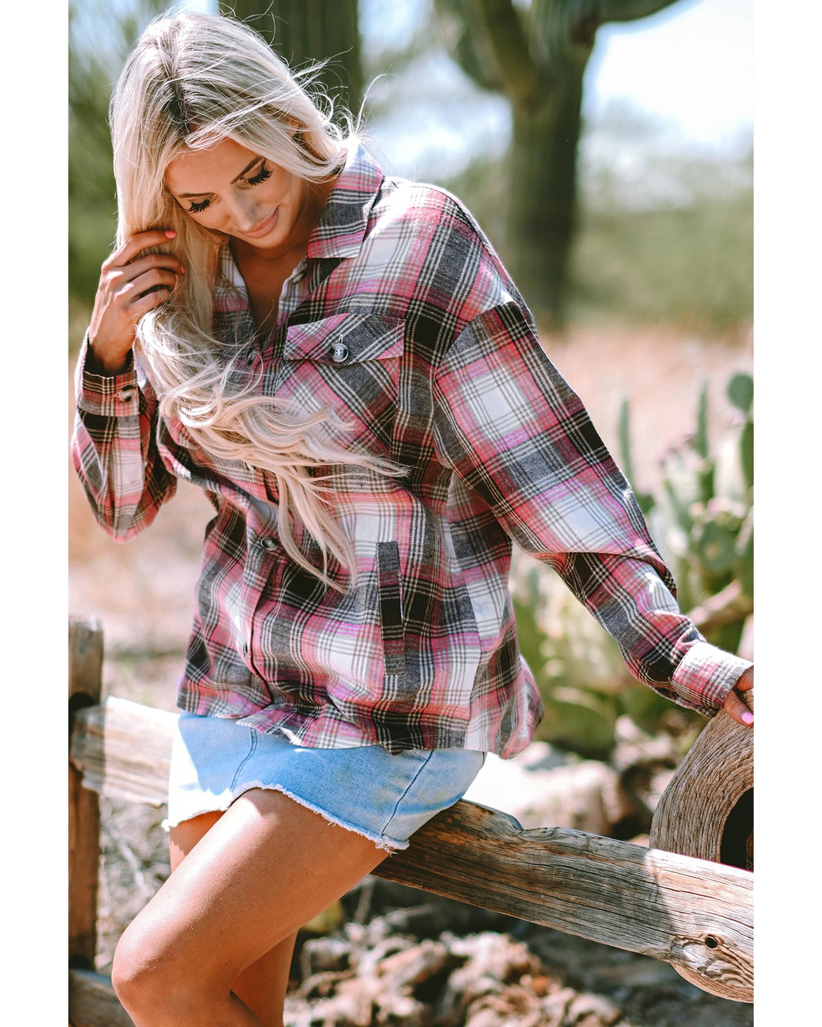 Pink Plaid Flap Pocket Button Up Shacket – 2XL