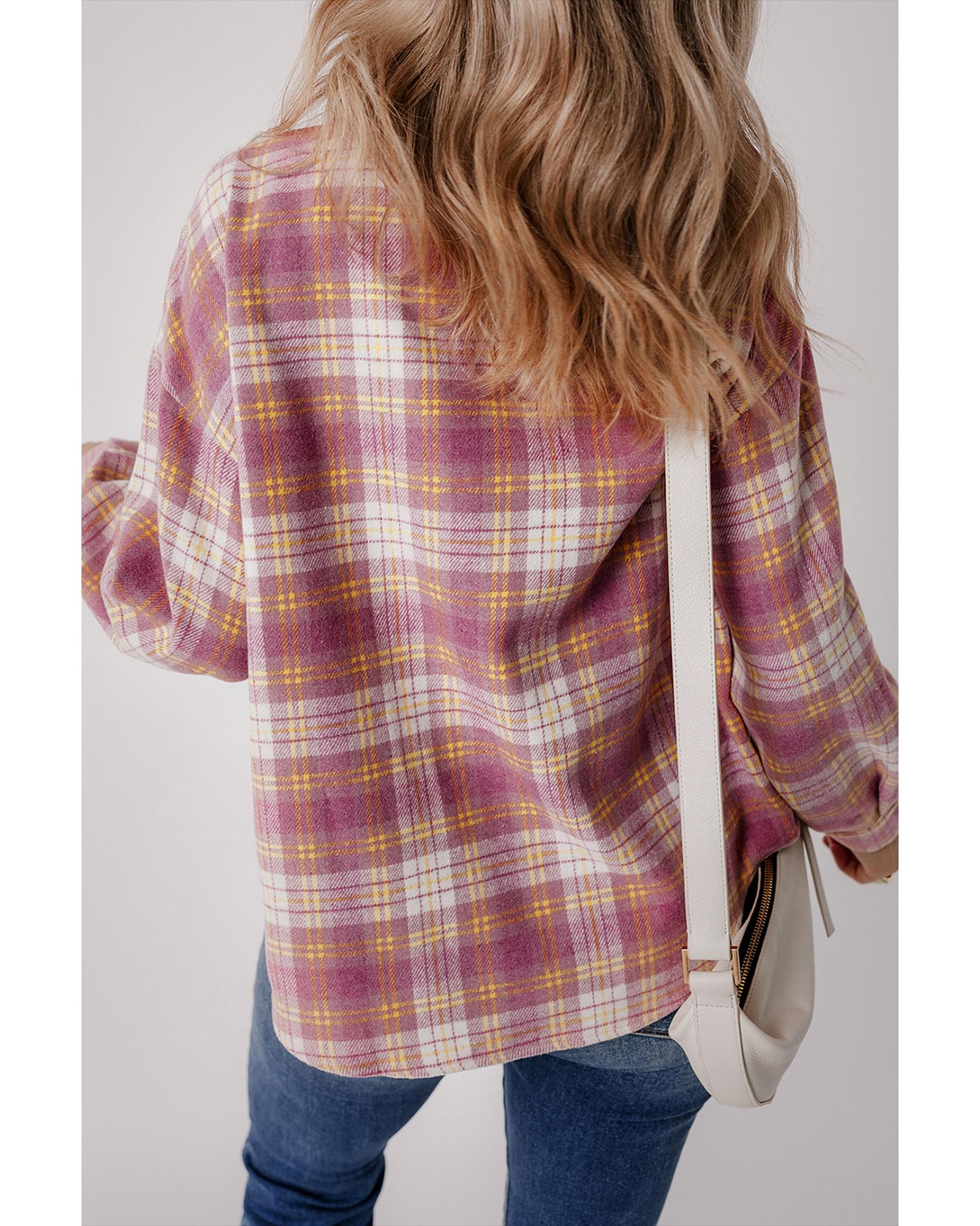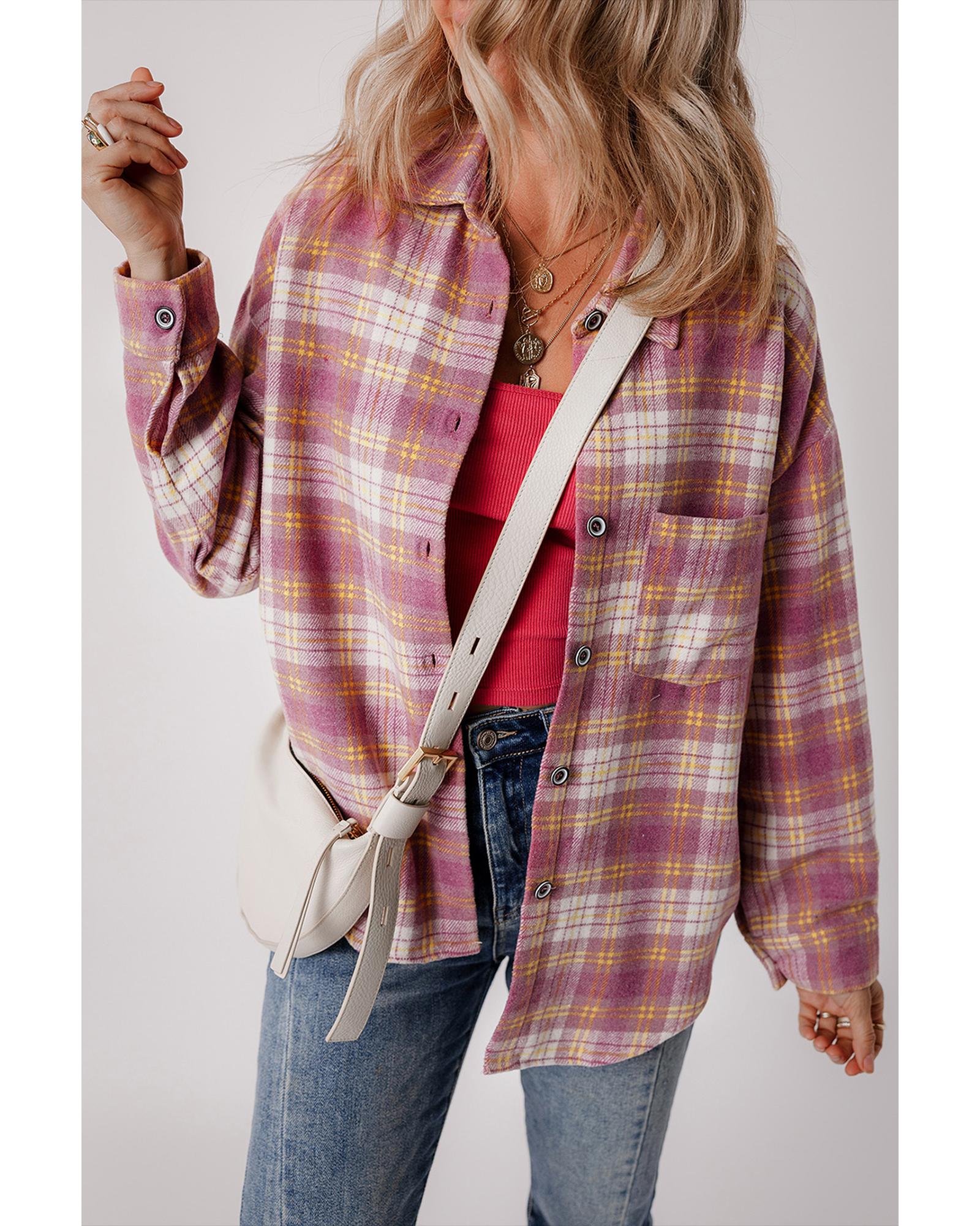 Pink Plaid Print Chest Pocket Long Sleeve Shacket – L