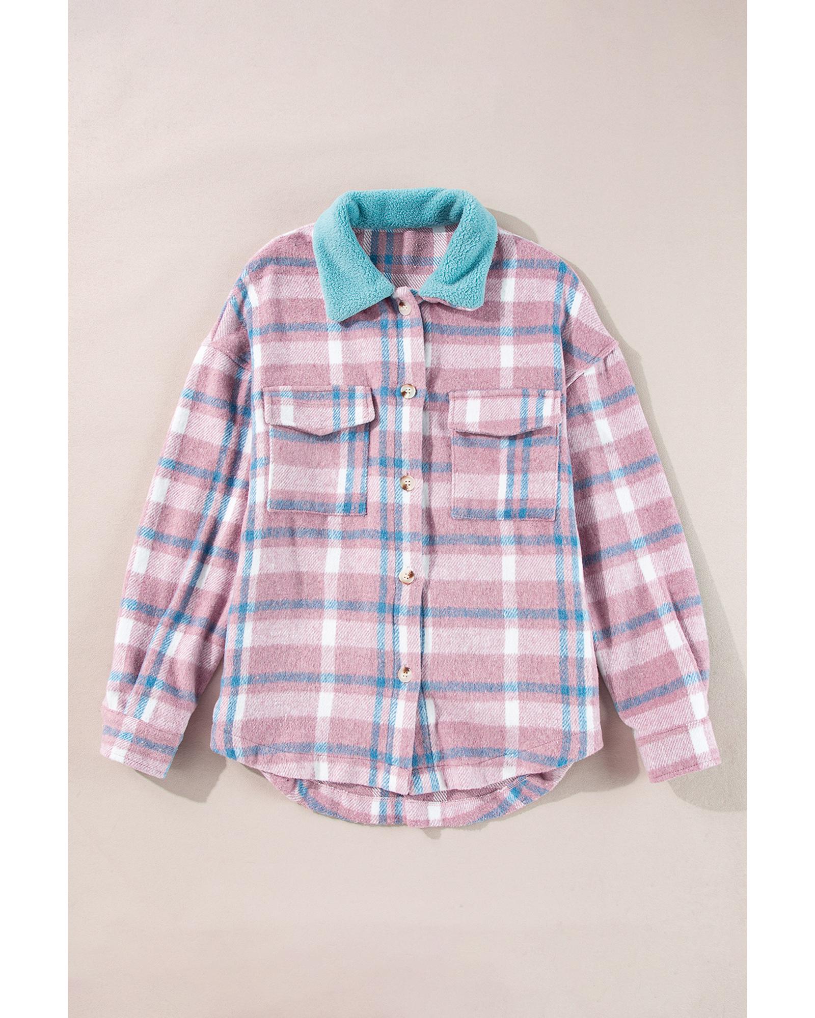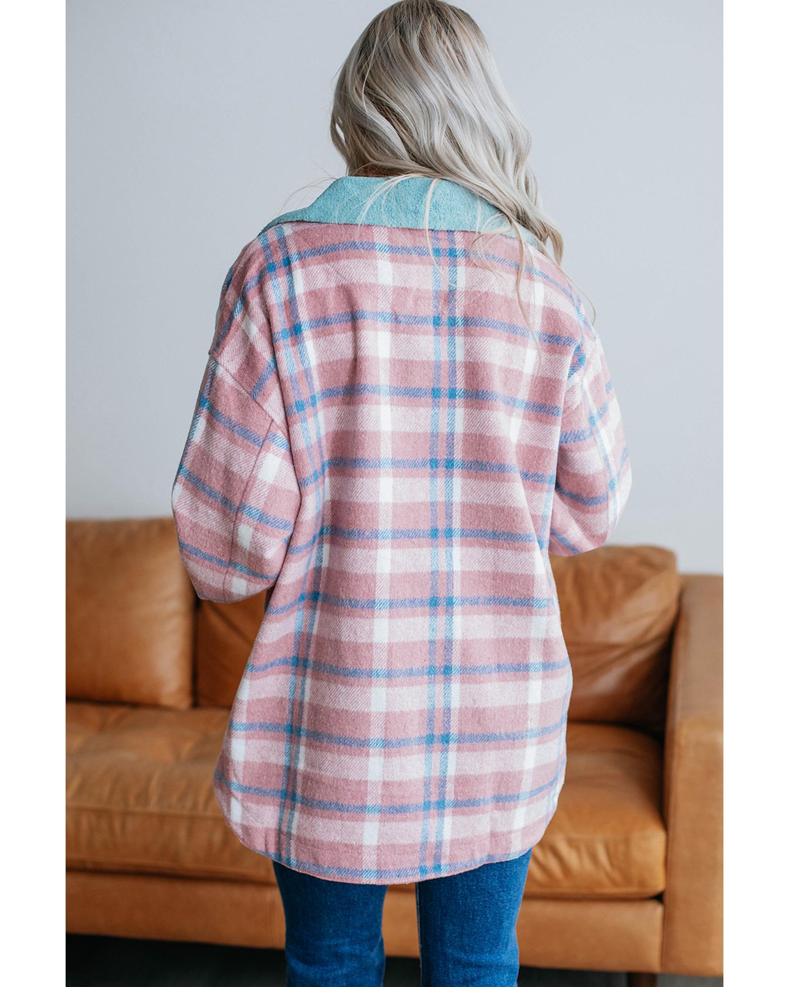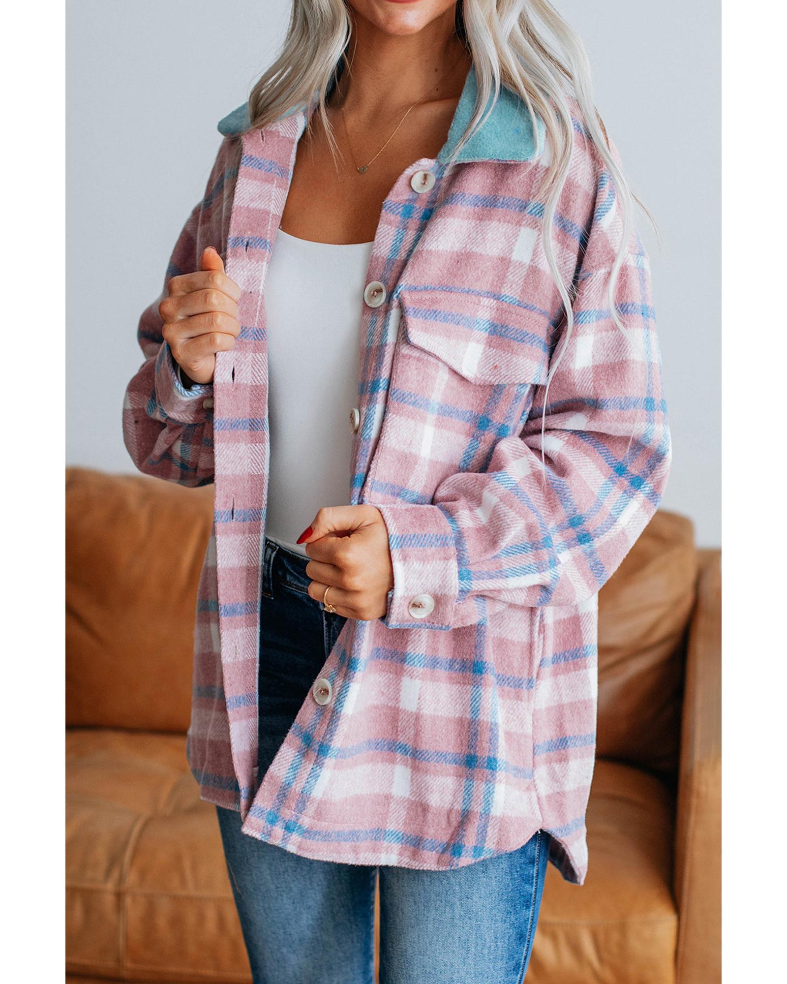 - Pink Plaid Print Color Block Collared Flap Pockets Loose Shacket