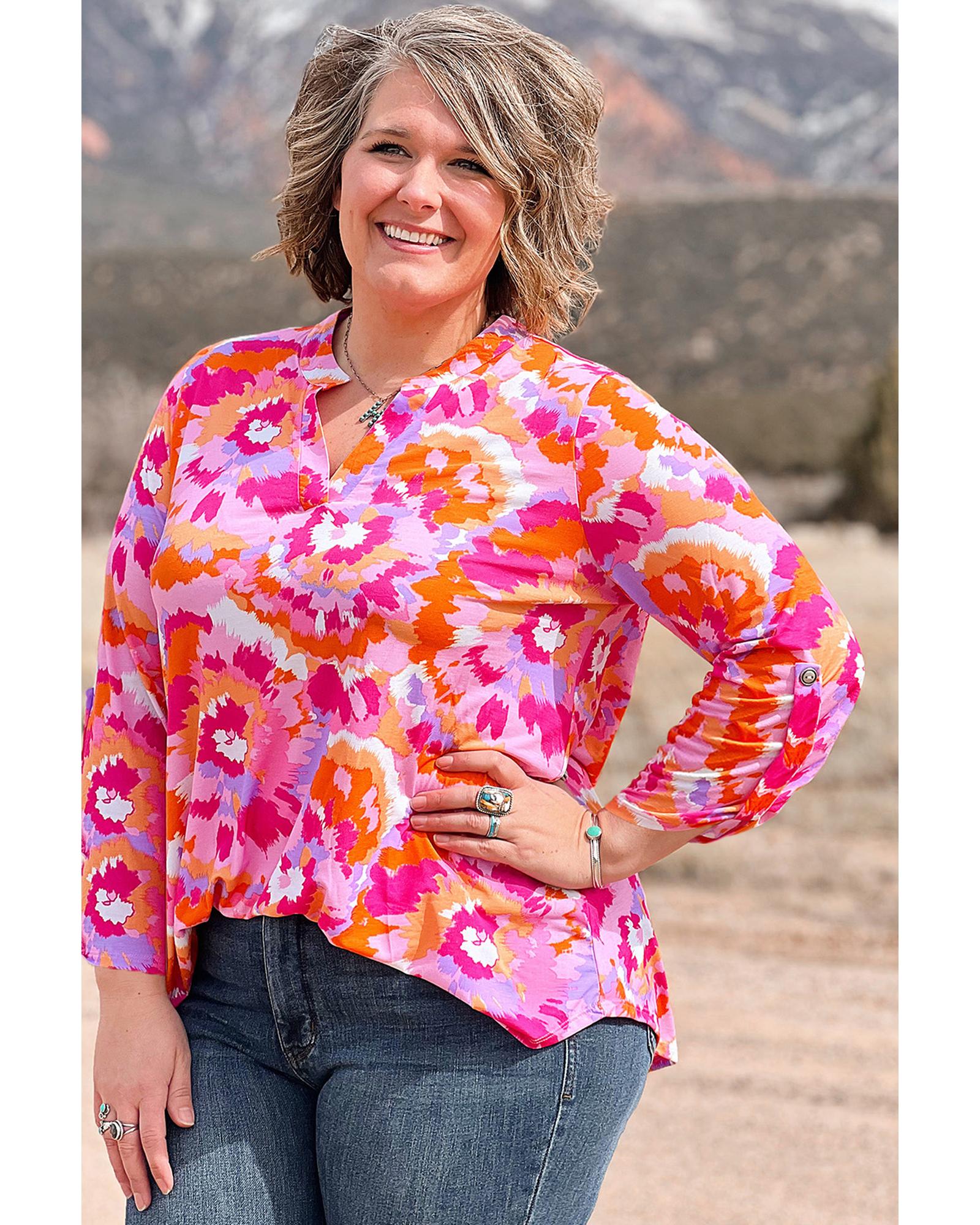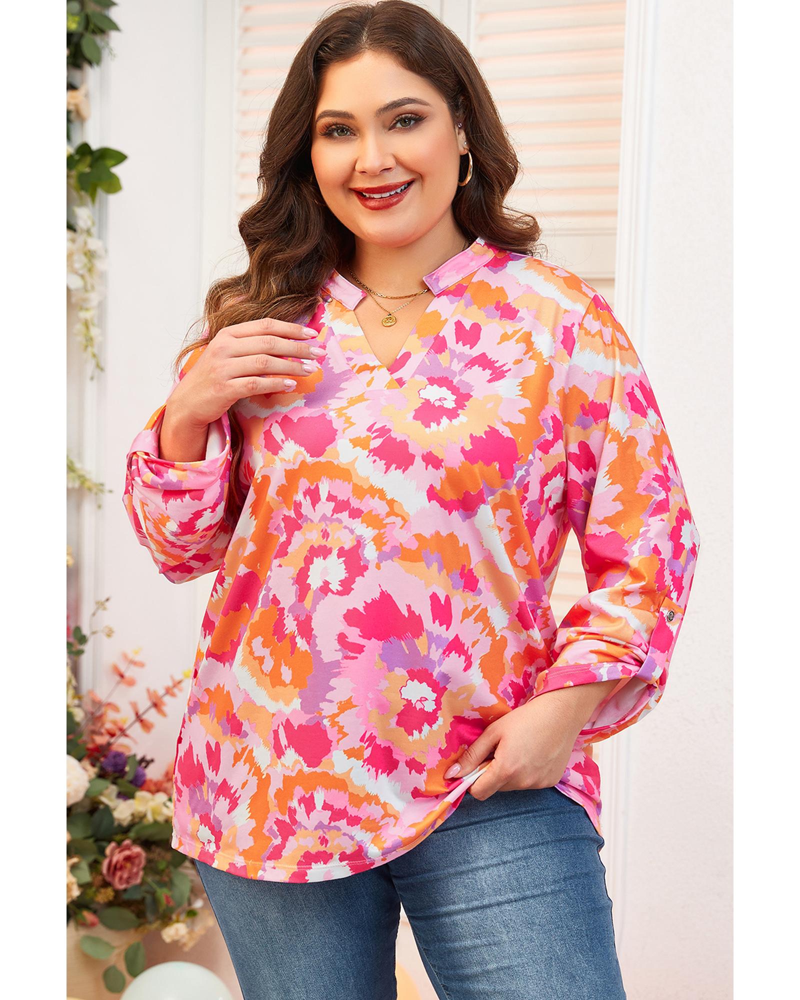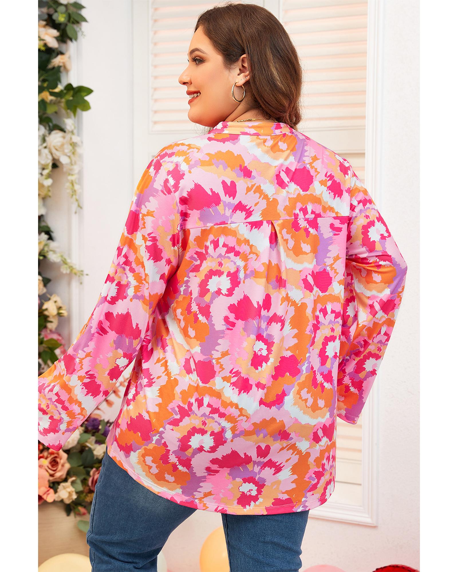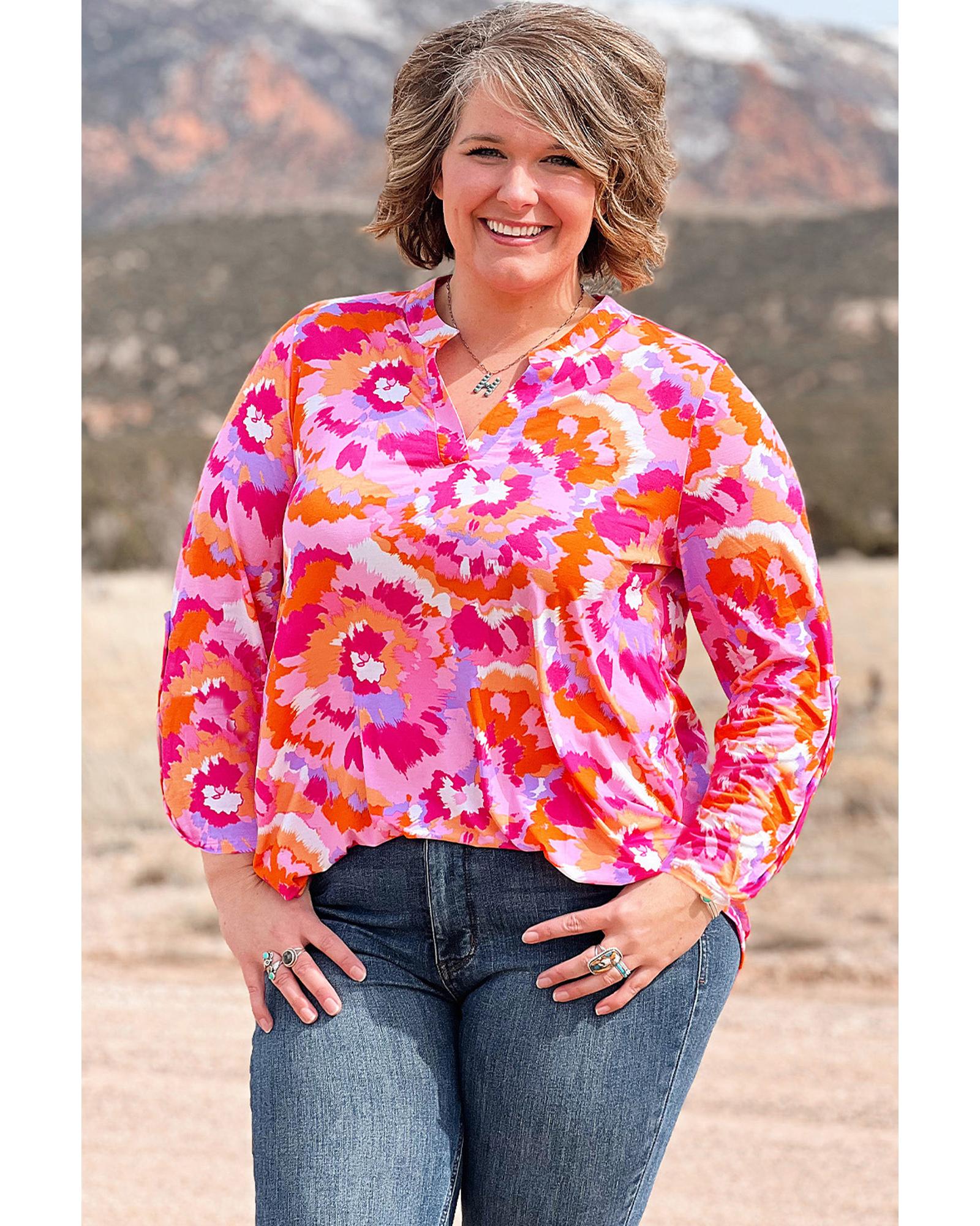 Pink Plus Size Abstract Floral Print V Neck Blouse – 2X
