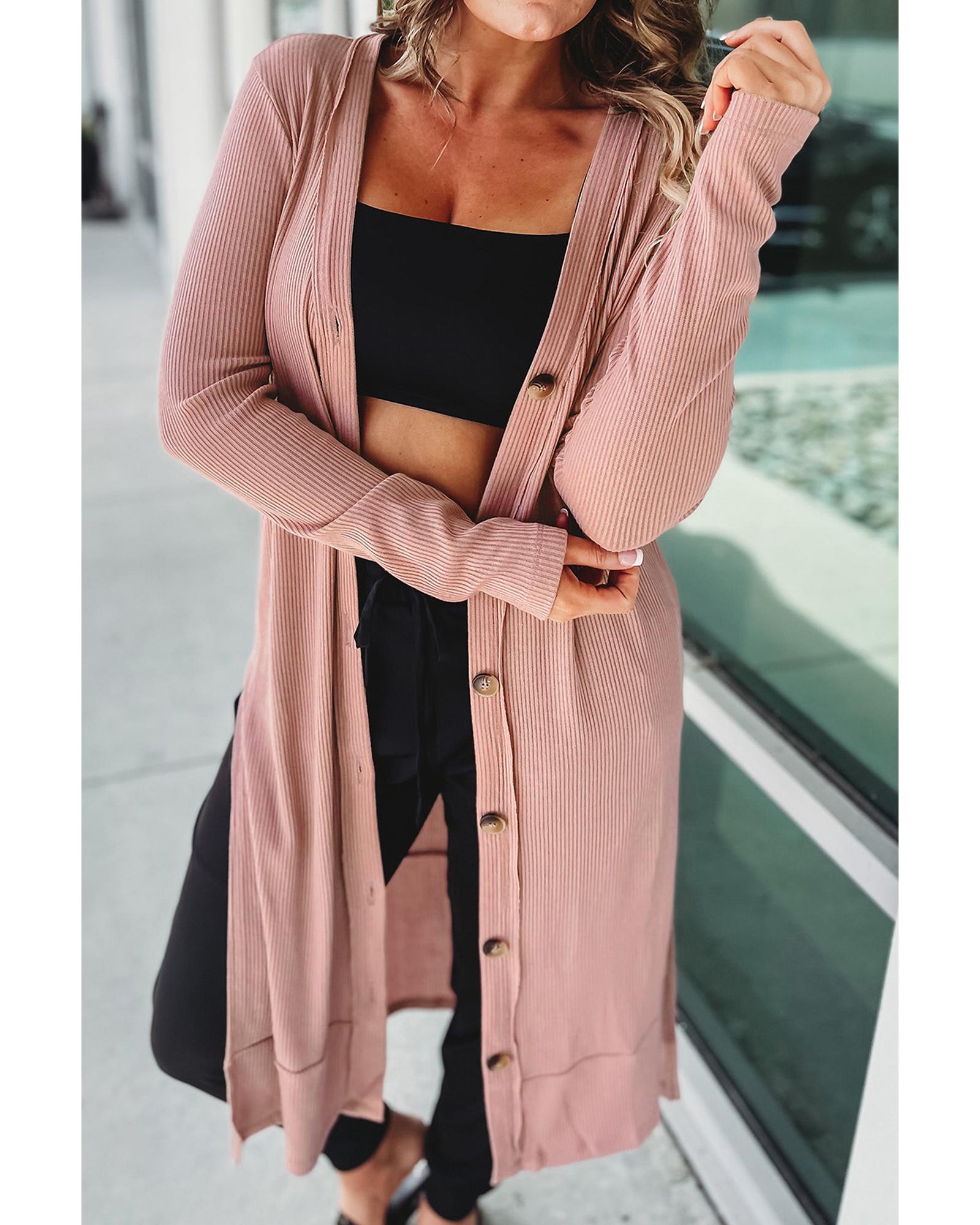 Pink Ribbed Button-Up Split Duster Cardigan – M
