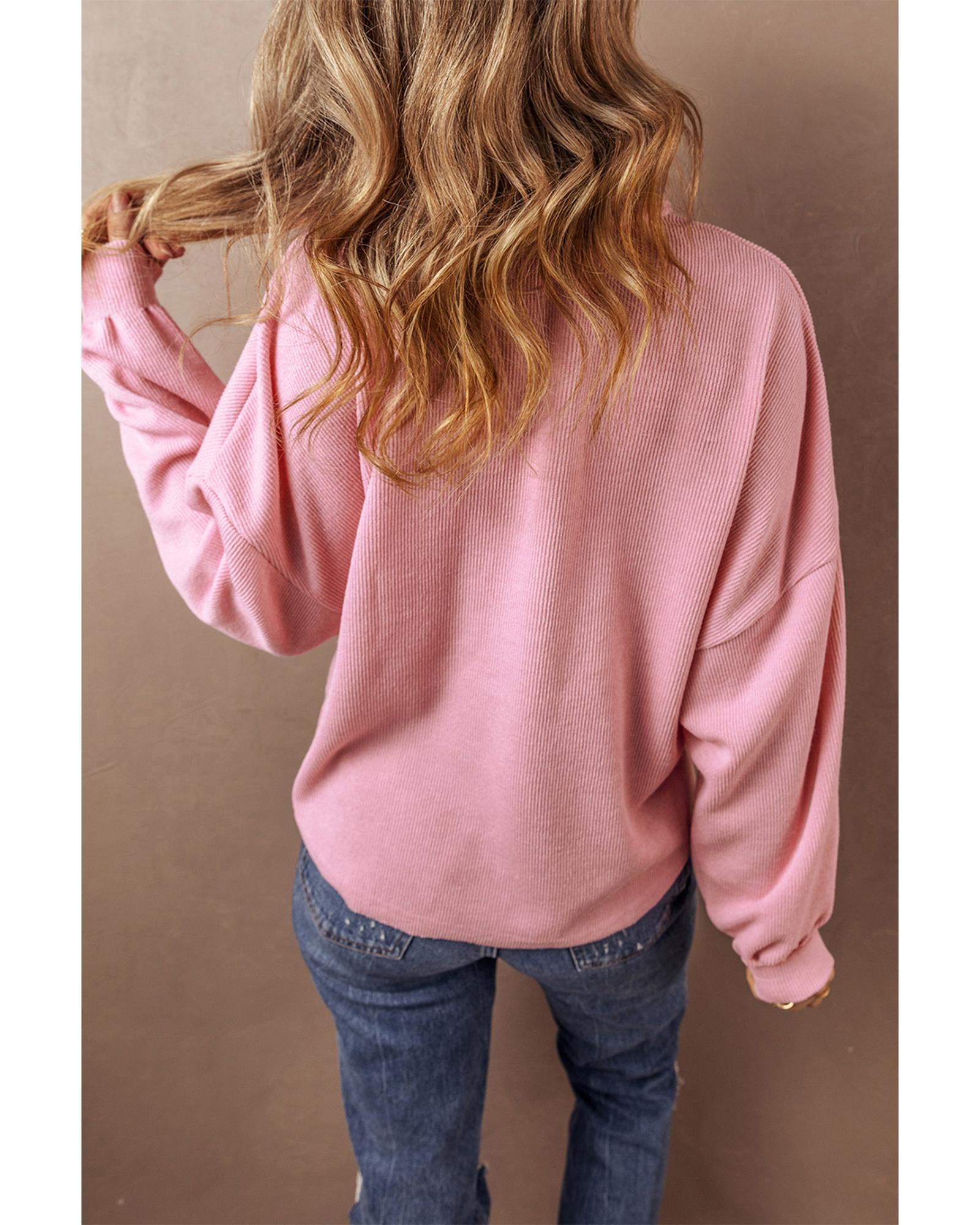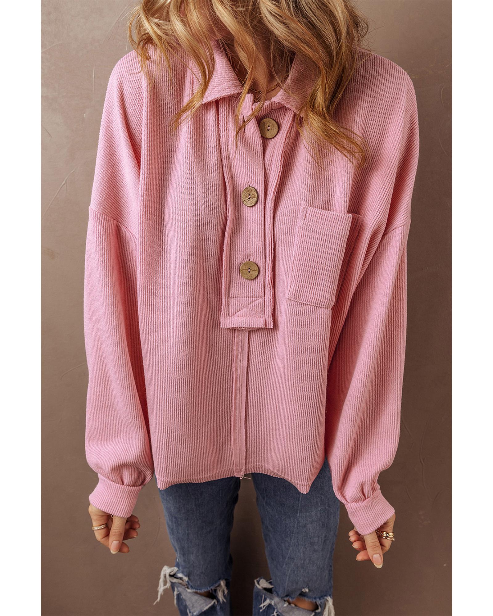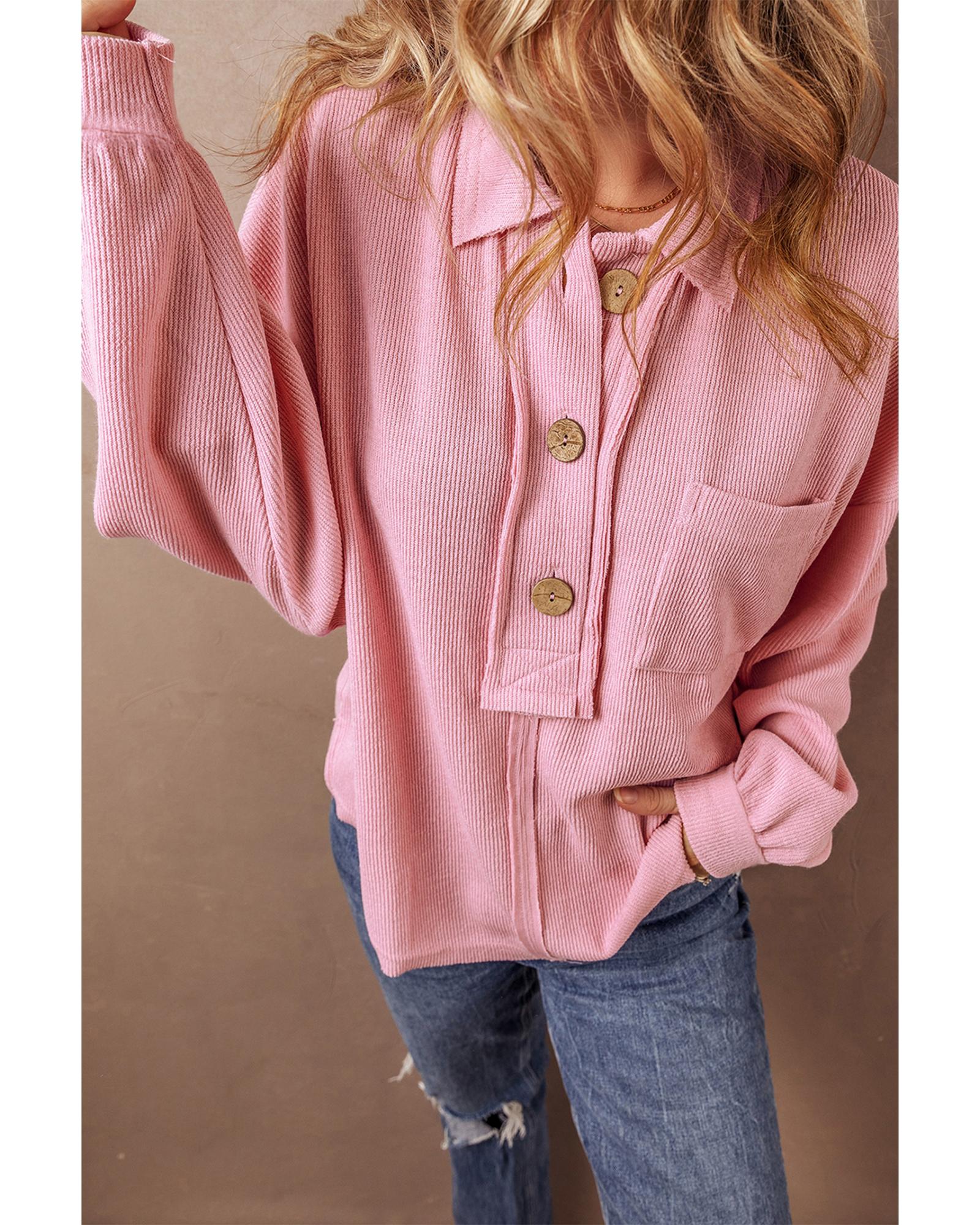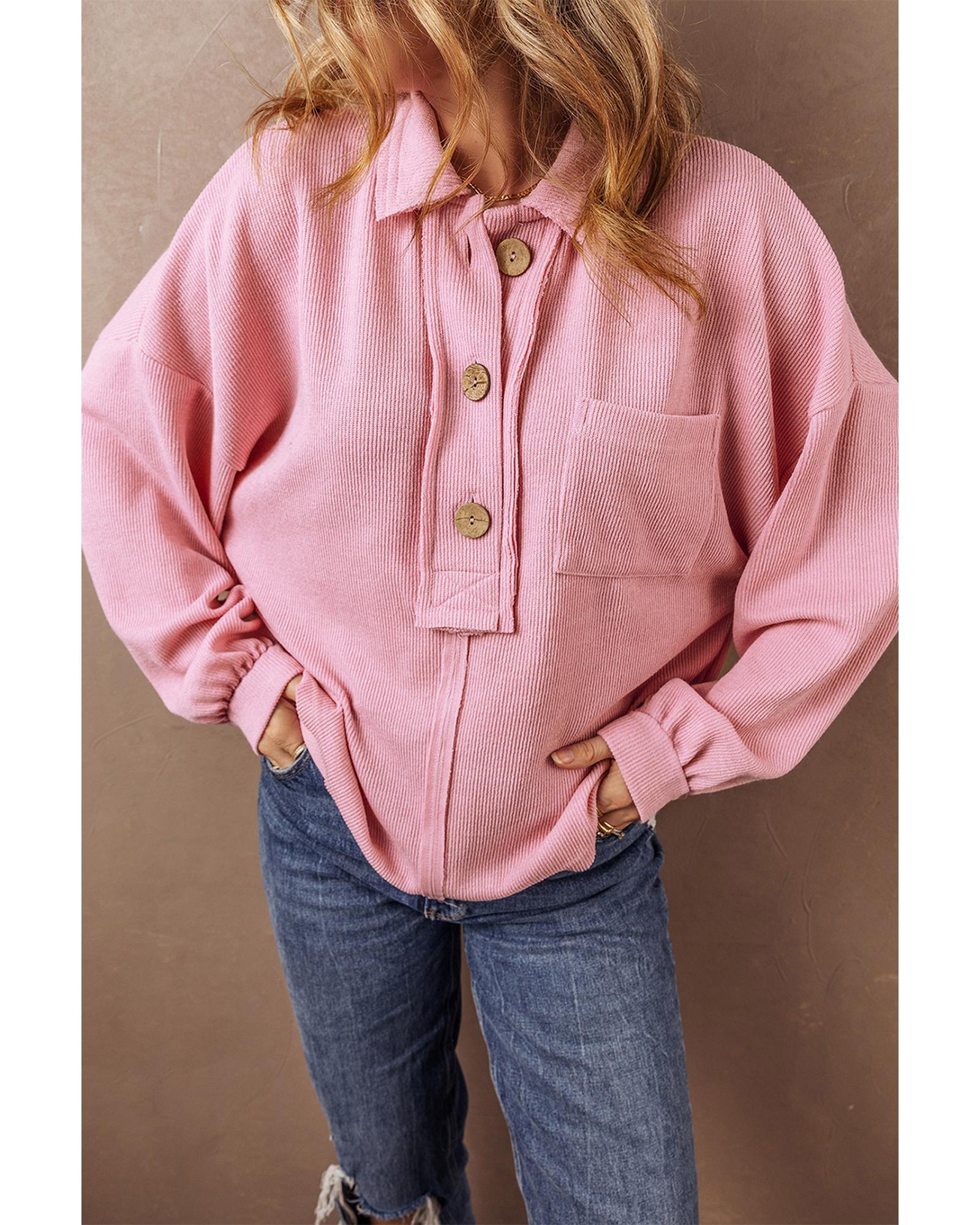 Pink Ribbed Knit Collared Henley Top with Chest Pocket – S