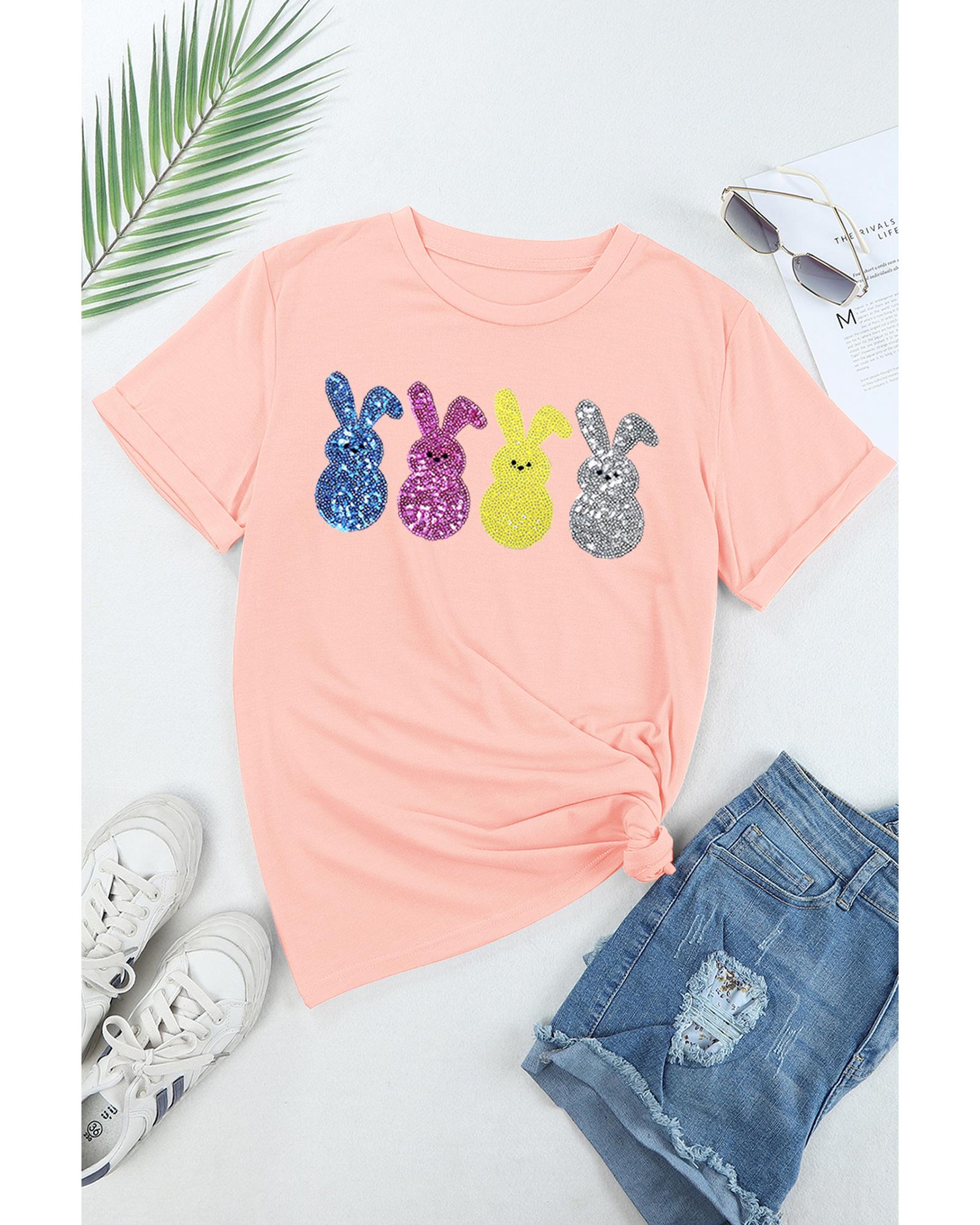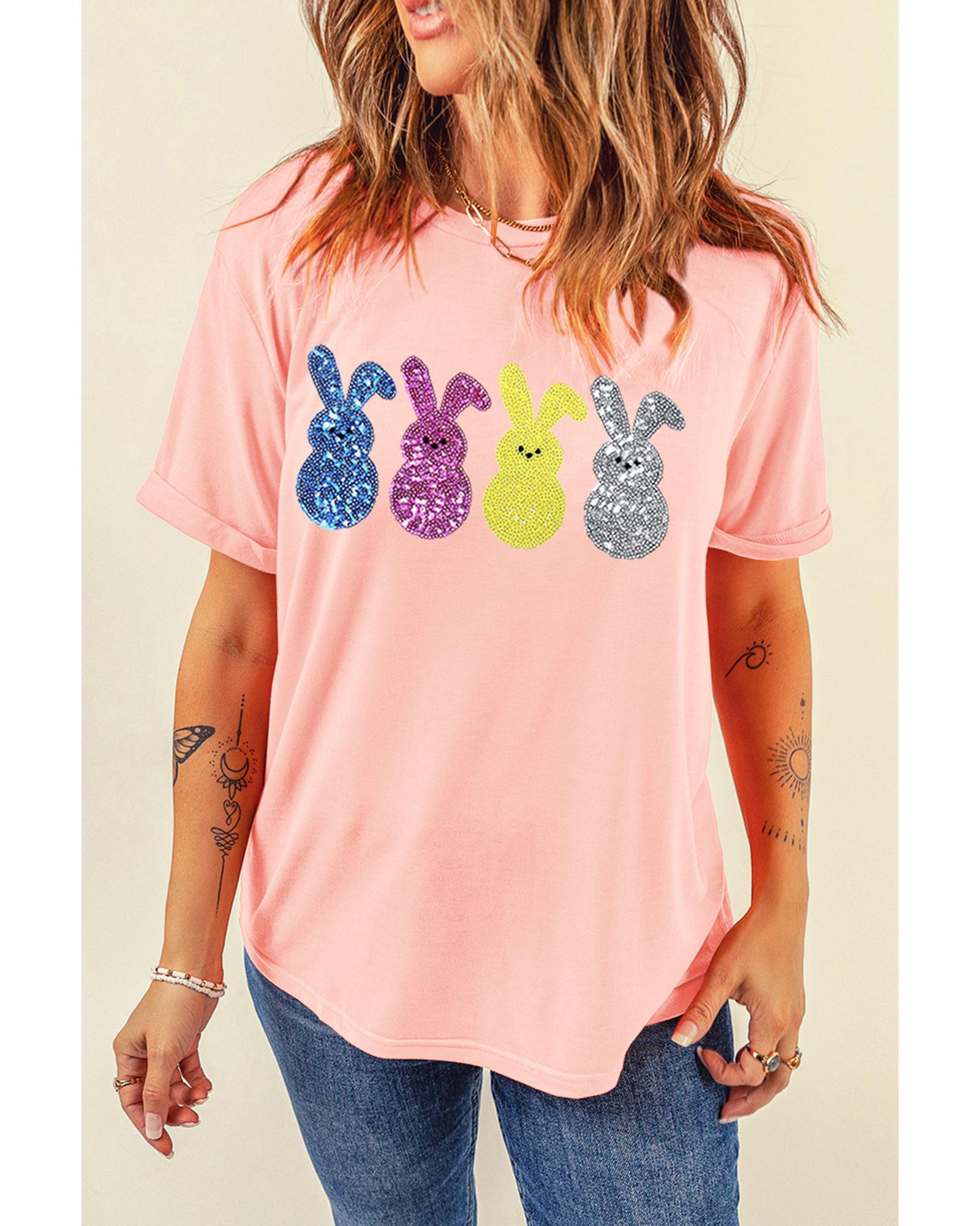 Pink Sequin Cute Bunny Graphic Easter Fashion Tee – 3XL