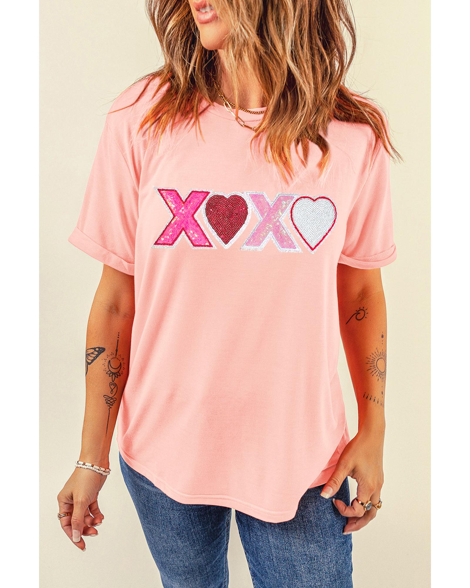 Pink Sequin Heart XOXO Patched Graphic Valentines T Shirt – M