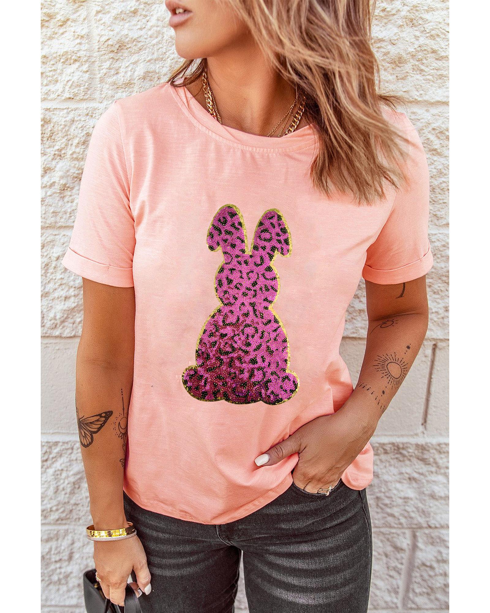 Pink Sequined Leopard Bunny Easter Graphic Tee – M