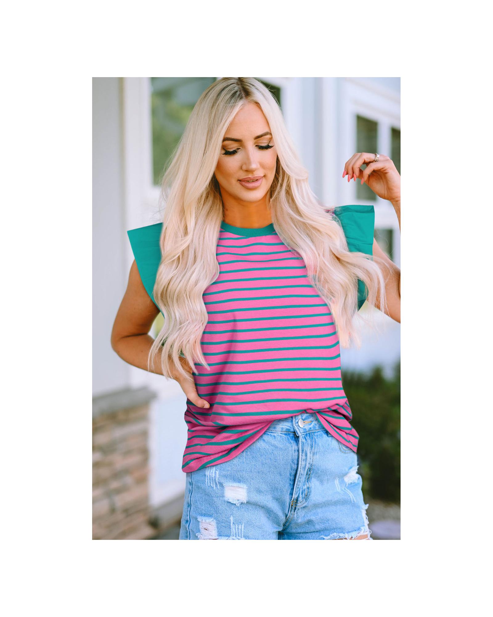 Pink Stripe Colorblock Ruffled Sleeve Crew Neck Blouse – L