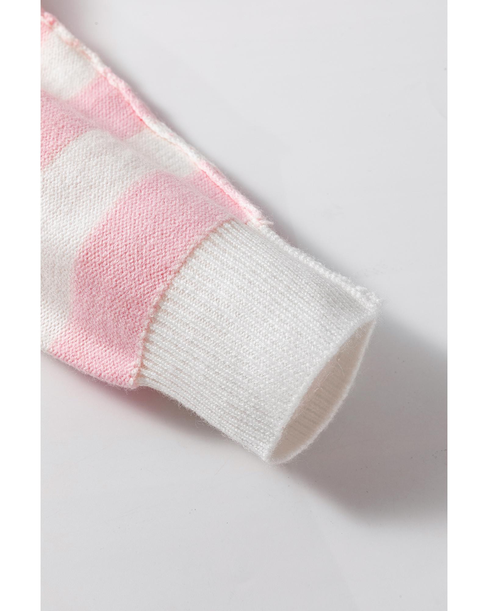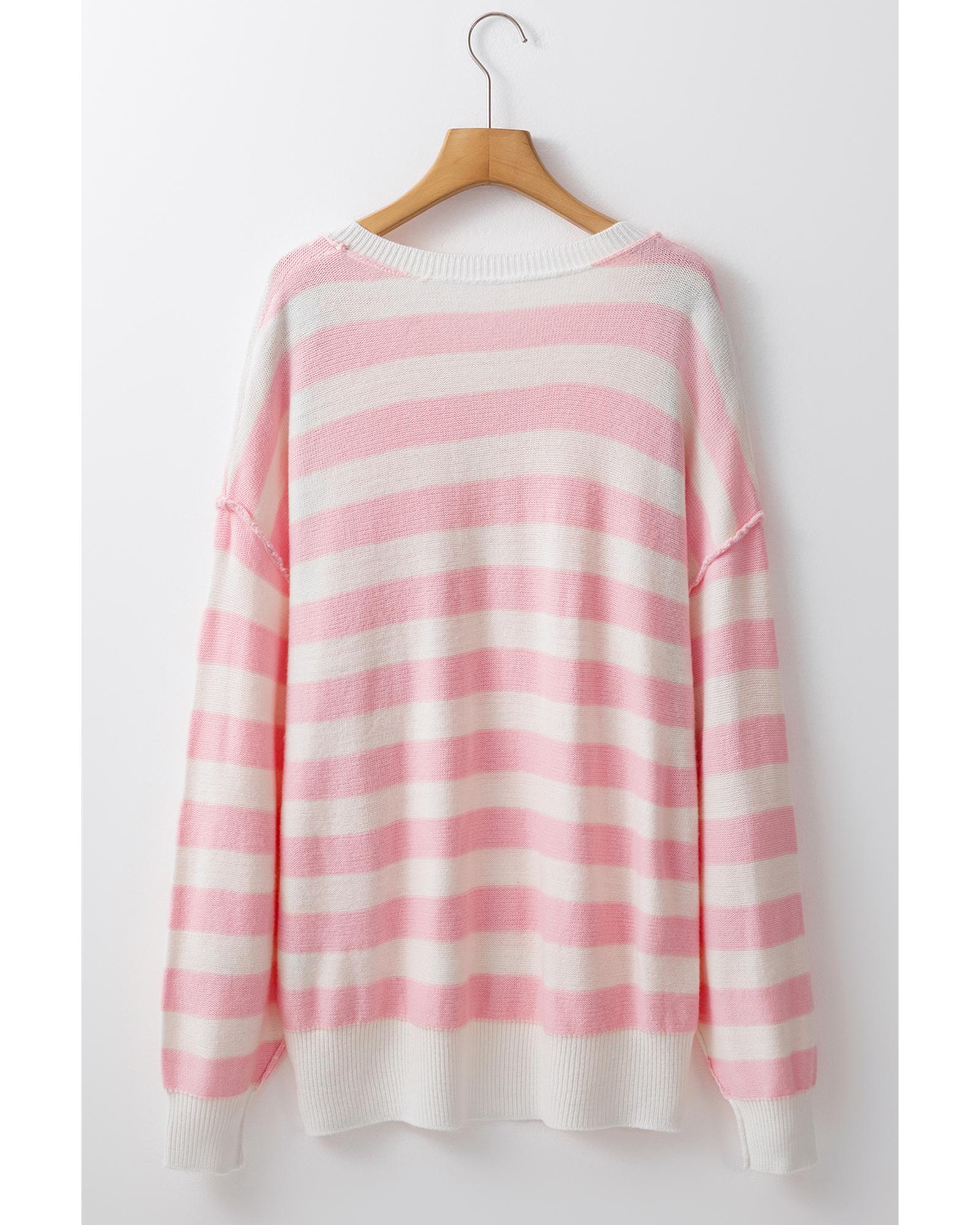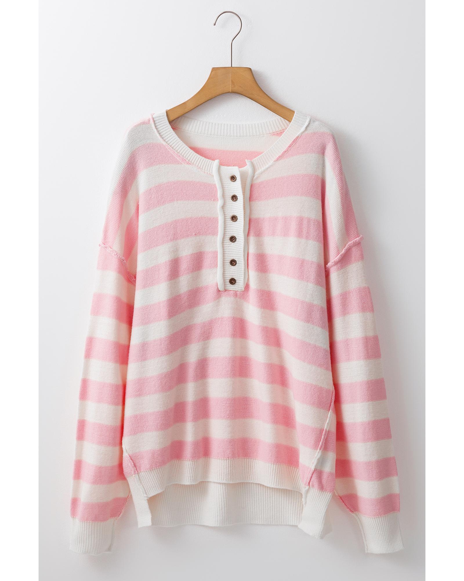 Pink Stripe Half Buttons Drop Shoulder Sweater – L