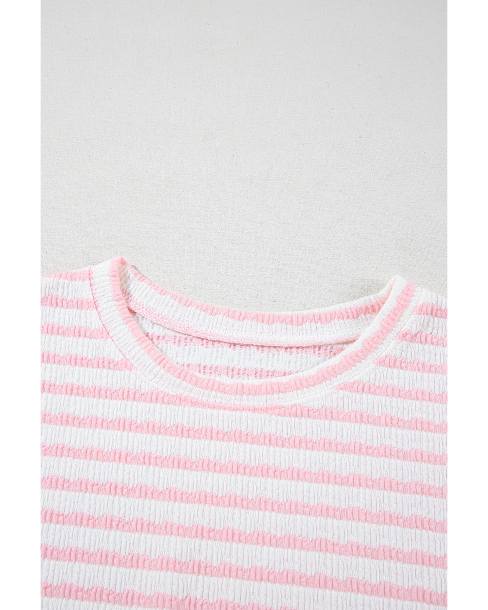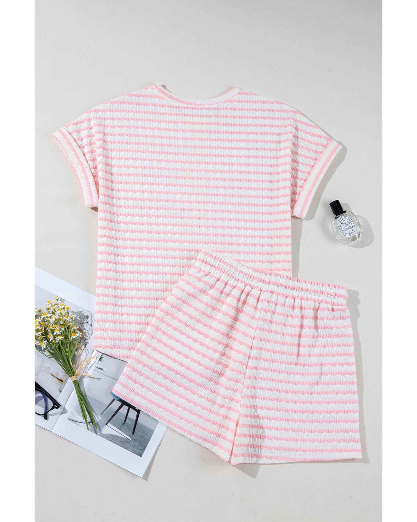Pink Stripe Knitted Short Sleeve Top and Drawstring Shorts Set – L