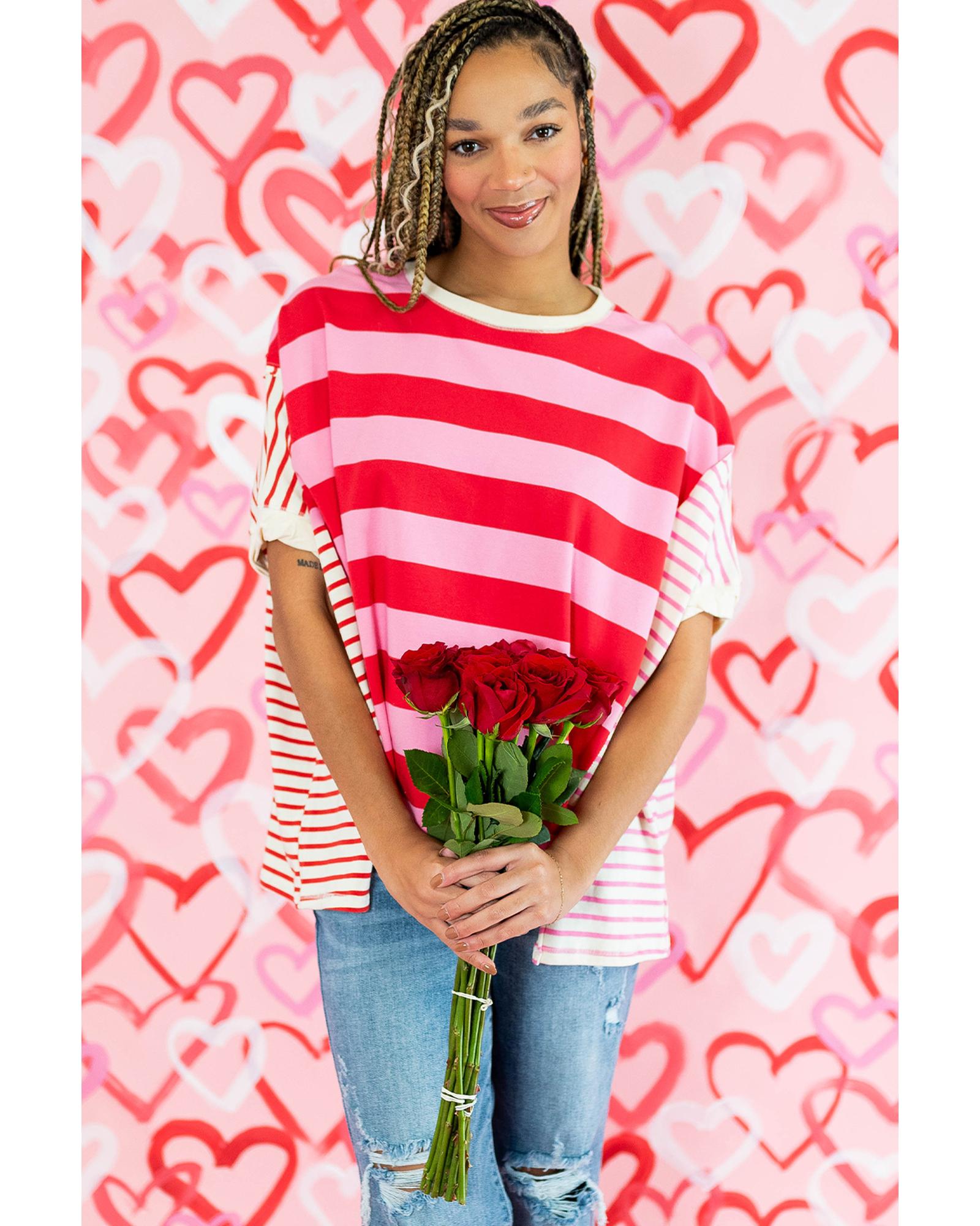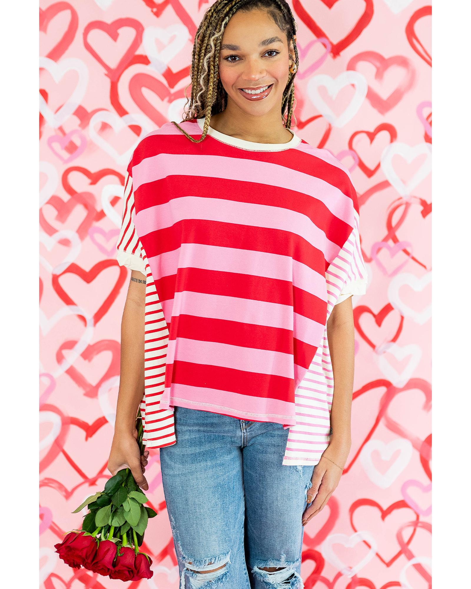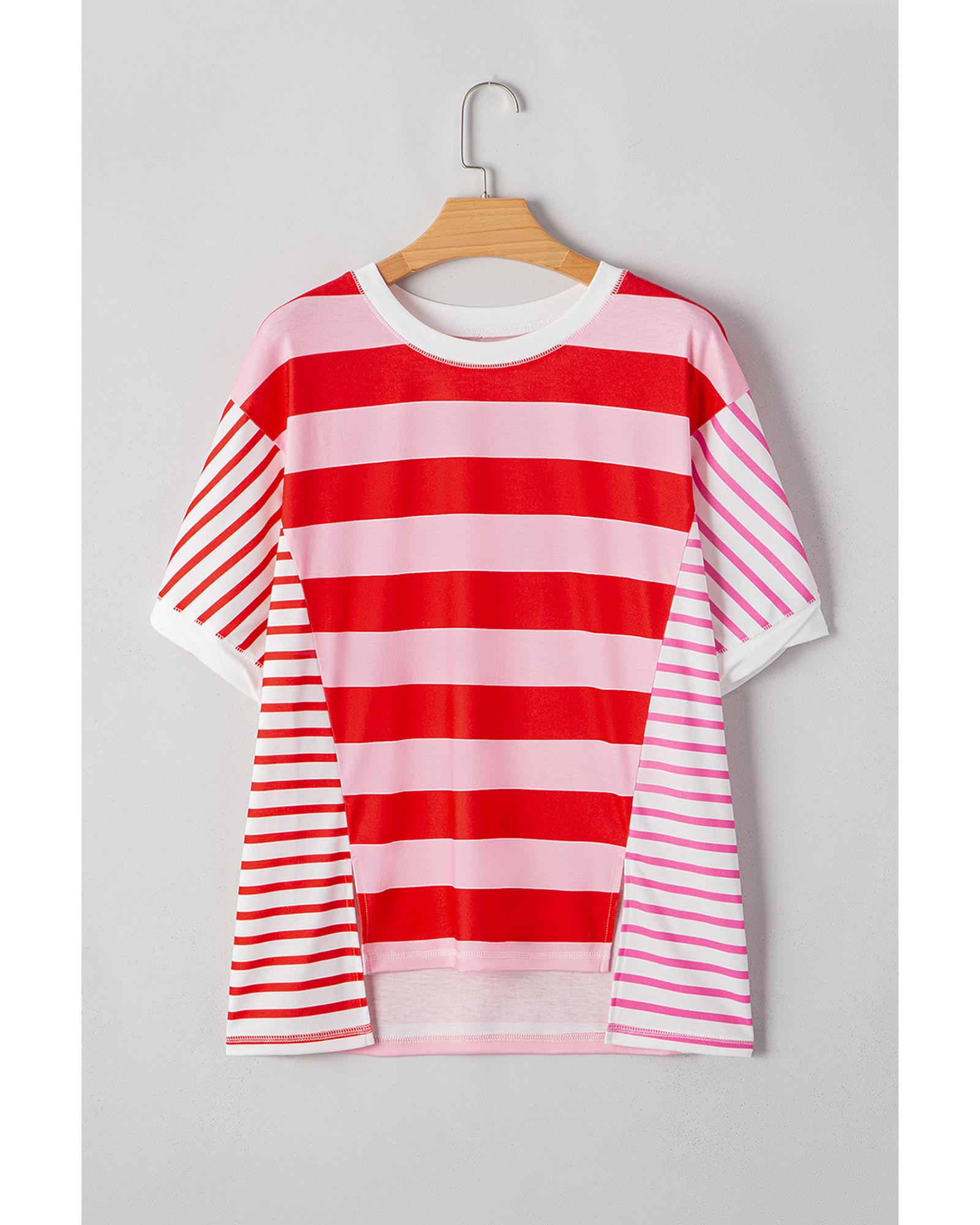 Pink Stripe Patchwork Round Neck Side Split Loose T Shirt – XL