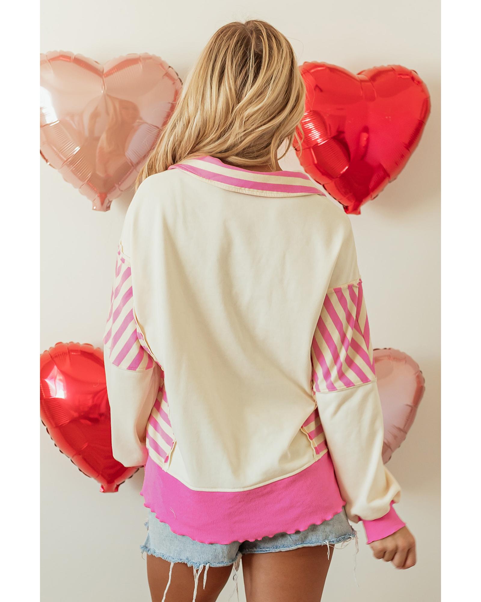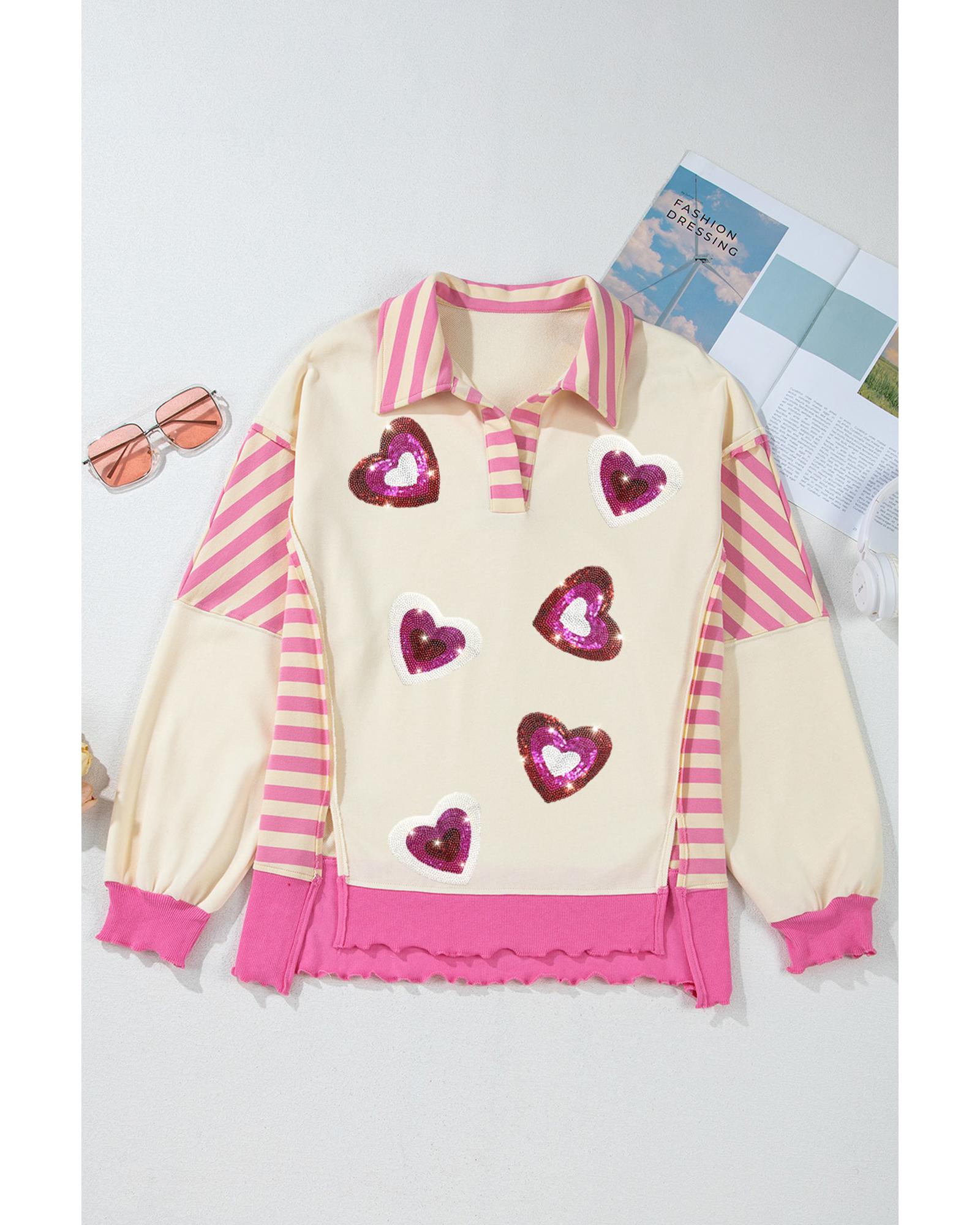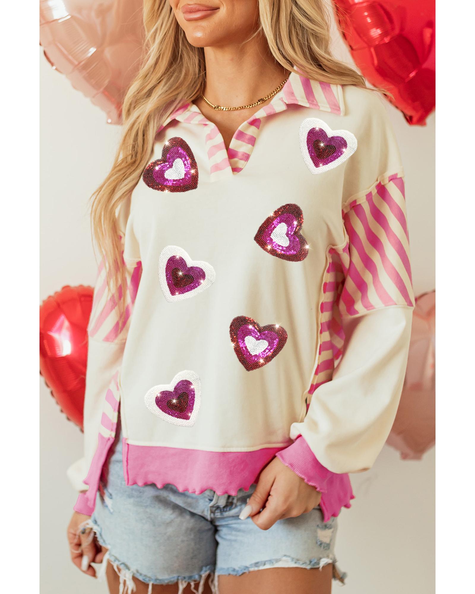 Pink Stripe Patchwork Sequin Heart Pattern Long Sleeve Collared Split Top – XL