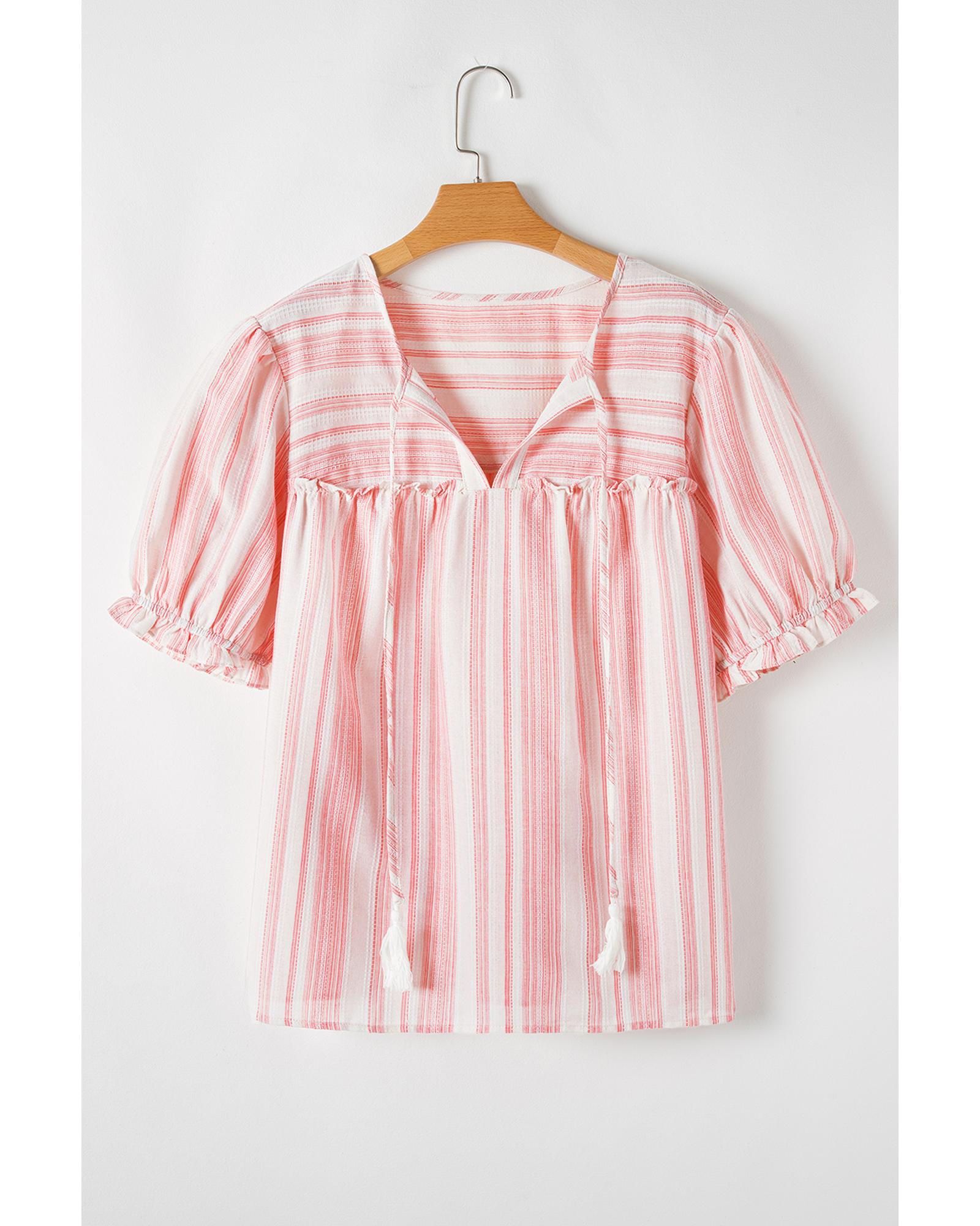 Pink Stripe Plus Size Tassel Tie Frilled Detail Short Sleeve Blouse – 4X