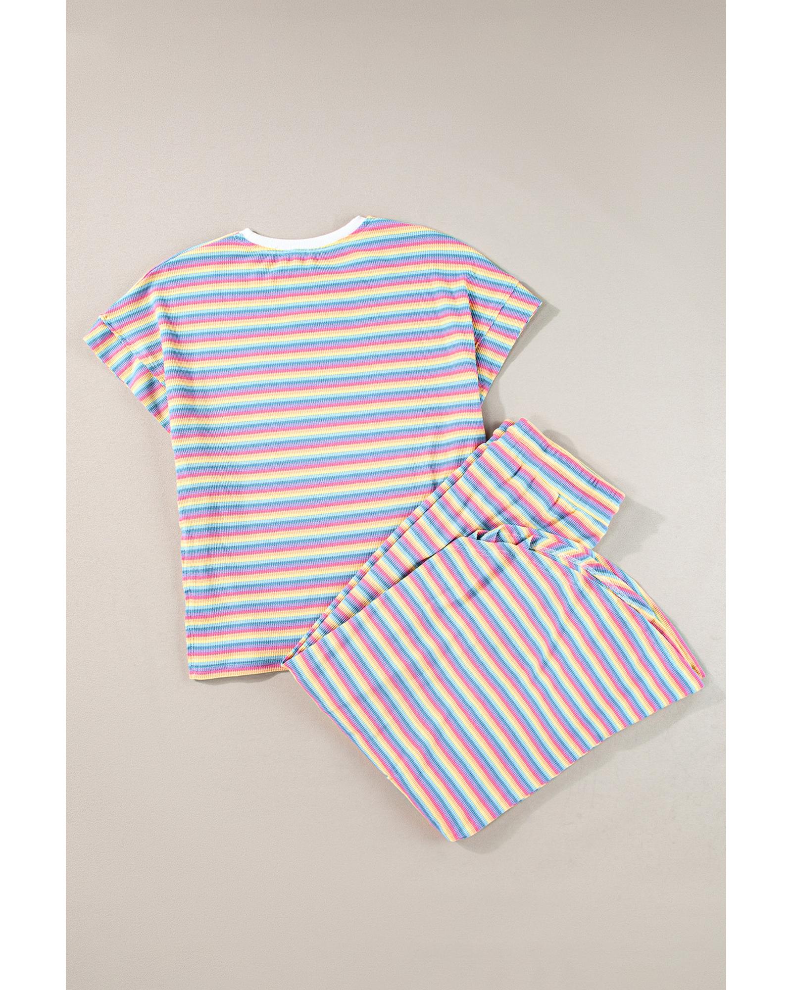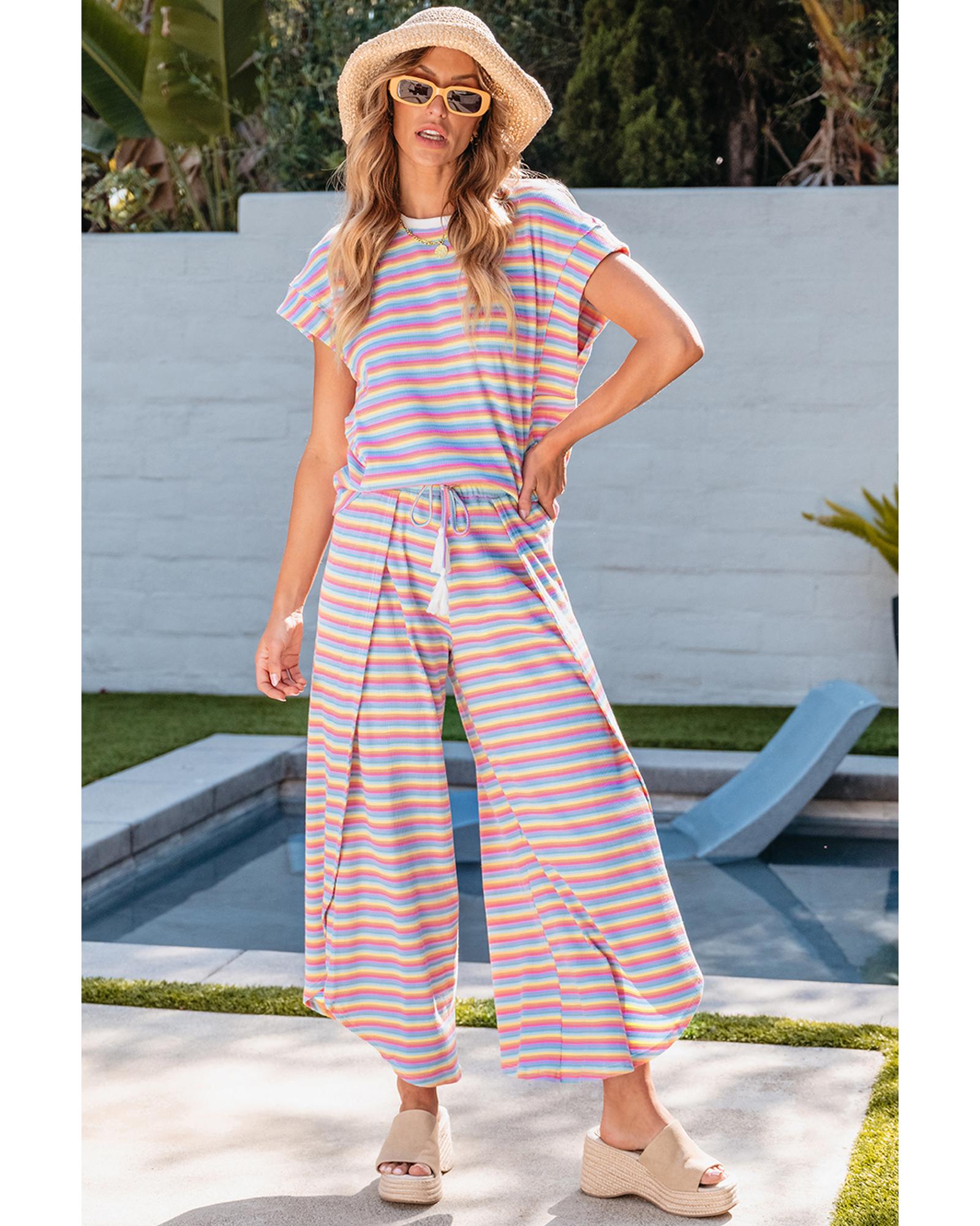 Pink Stripe Rainbow Tee Tasseled String Wide Leg Pants Set - M