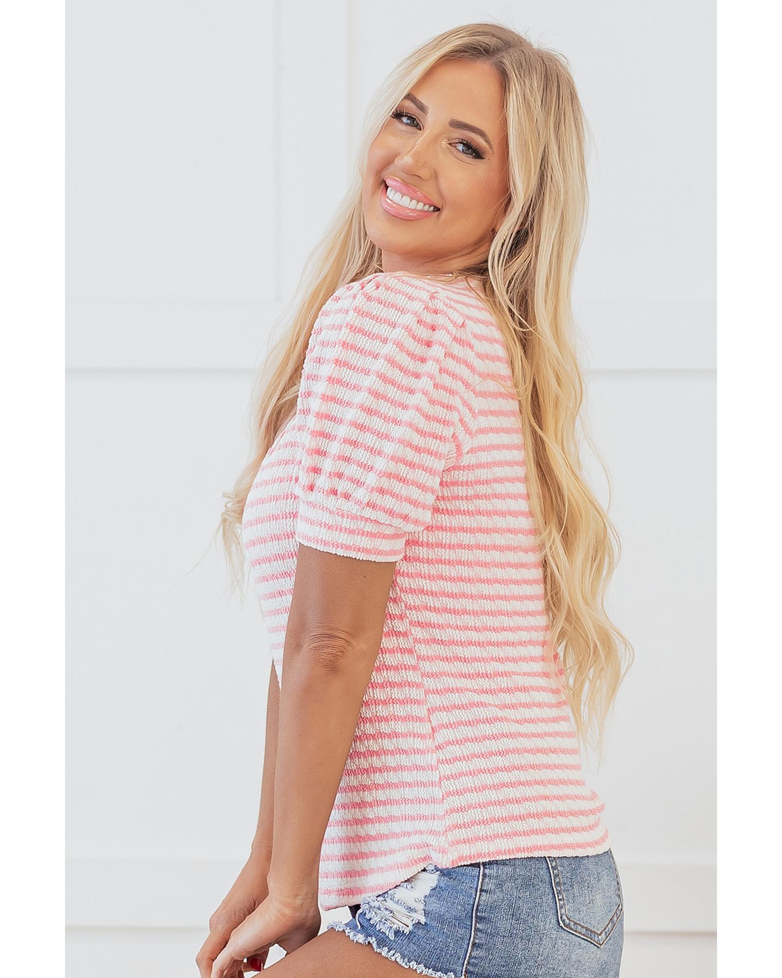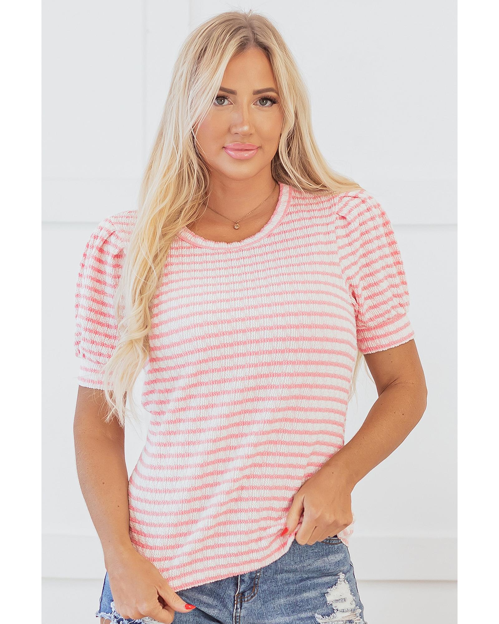 - Pink Stripe Textured Puff Sleeve Crewneck Top