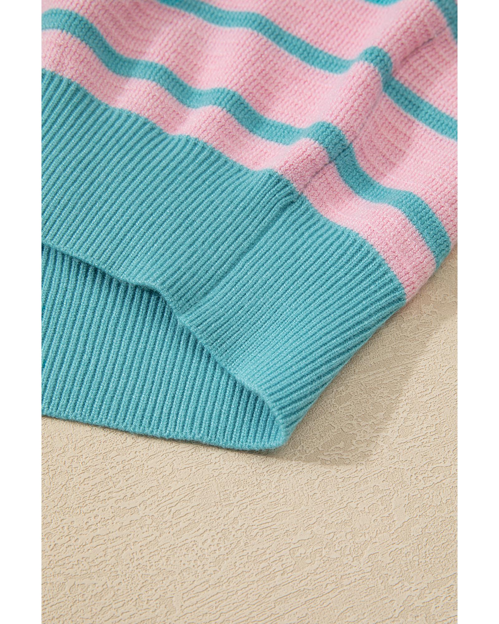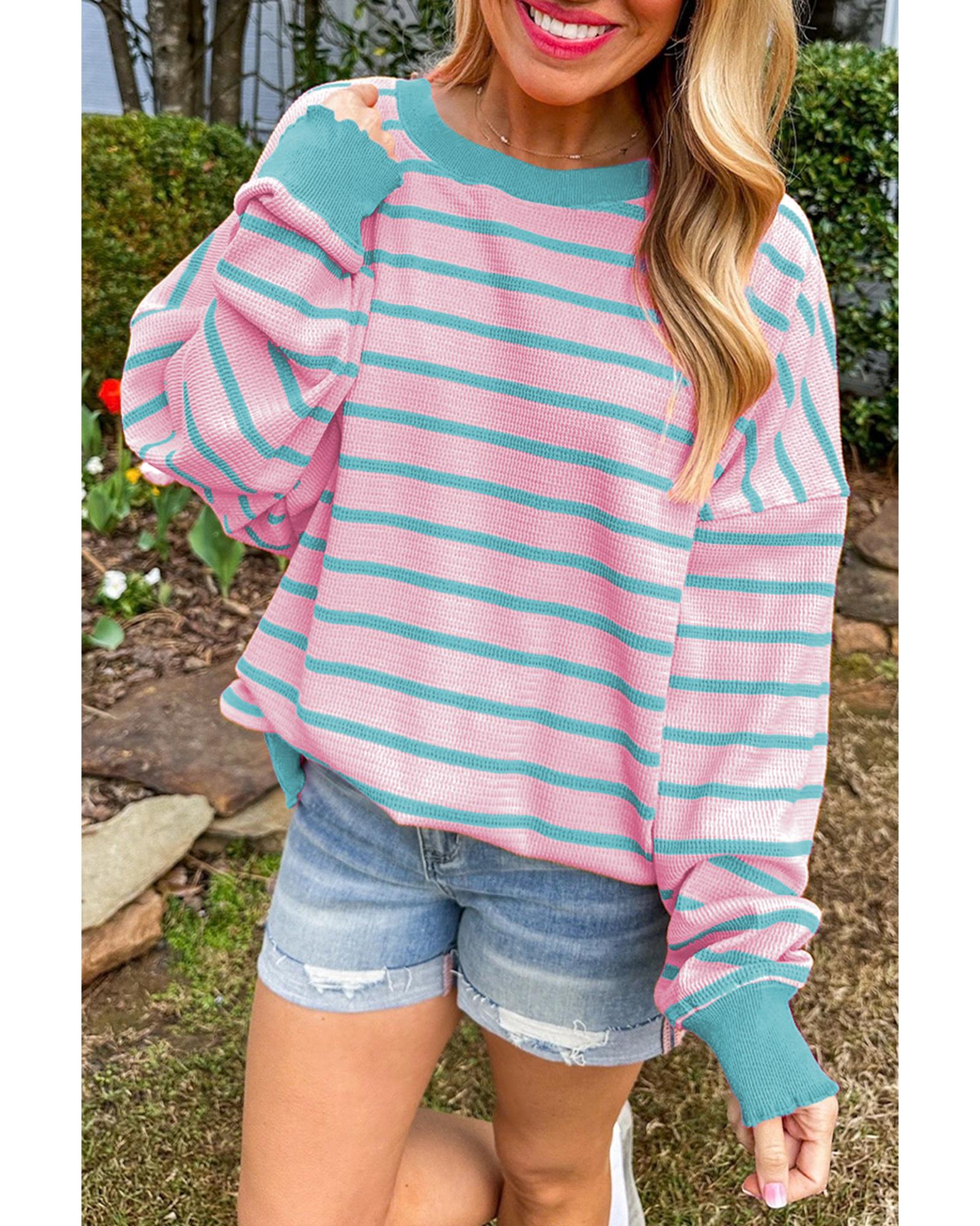 Pink Stripe Trimmed Round Neck Drop Shoulder Loose Sweater – XL