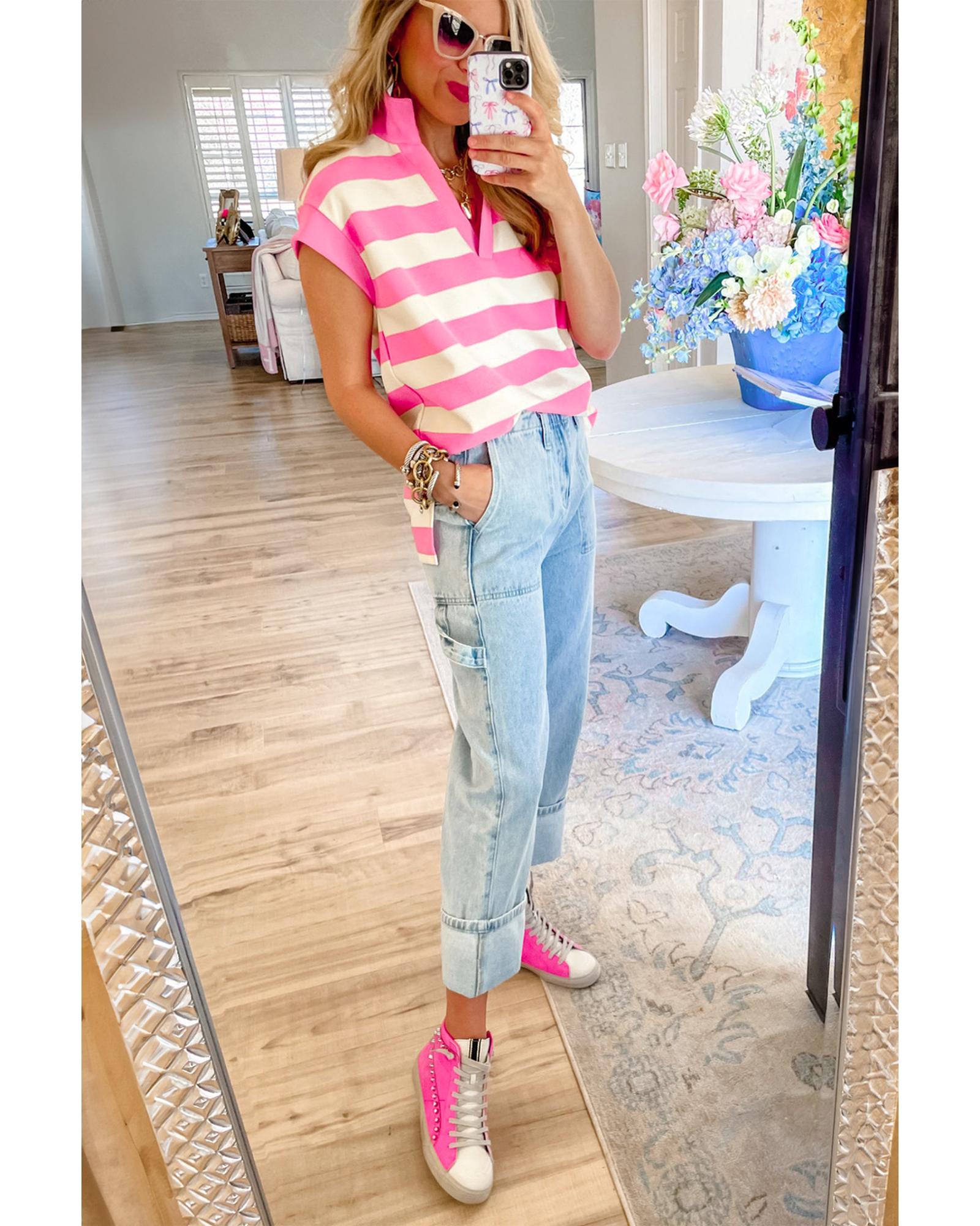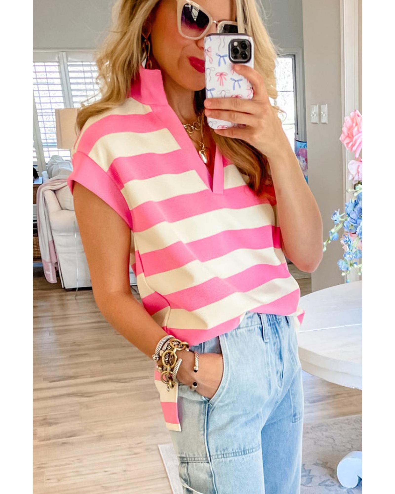 - Pink Stripe V Neck Collared Cap Sleeve Top
