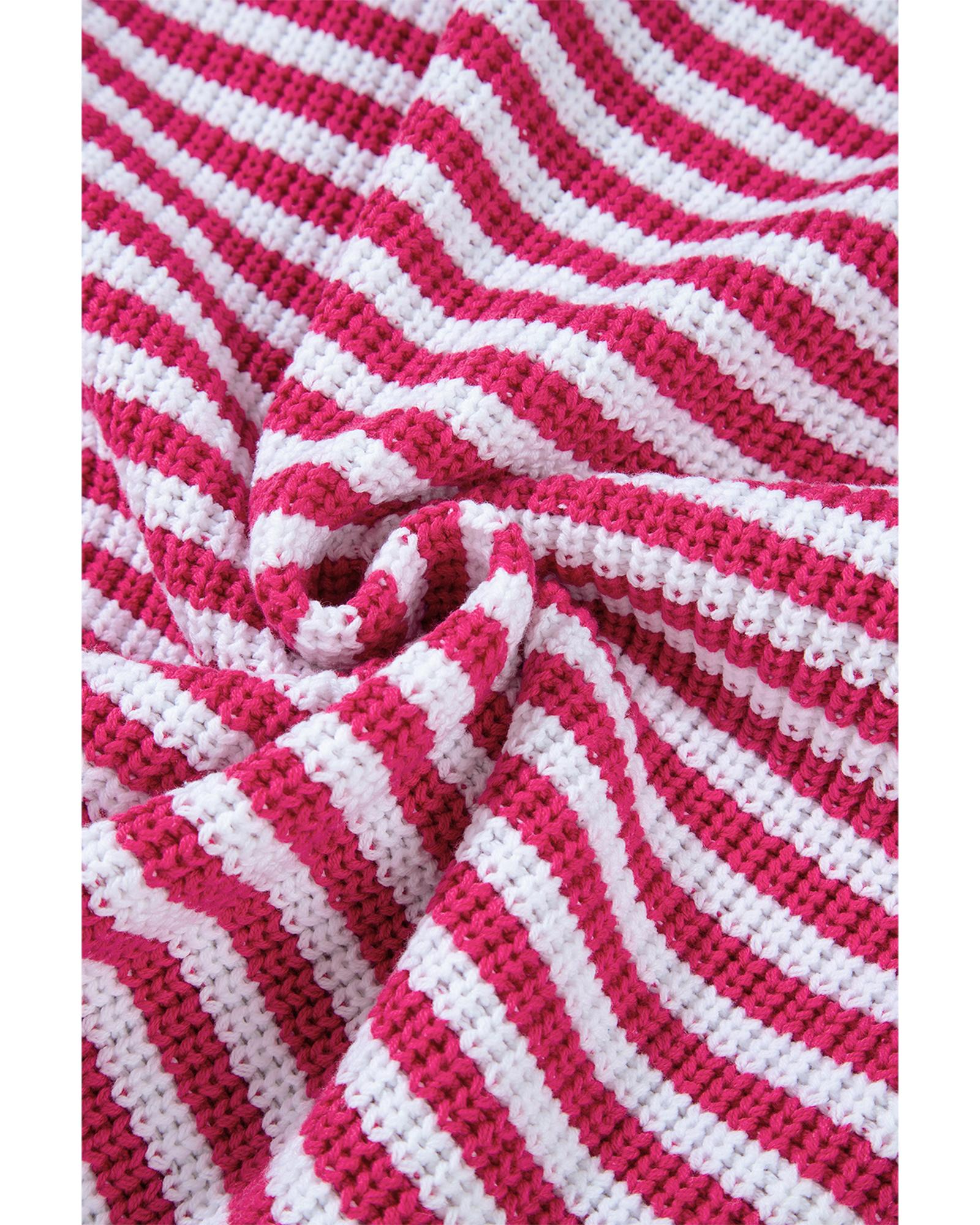 Pink Stripe Trimmed Round Neck Drop Shoulder Loose Sweater - L