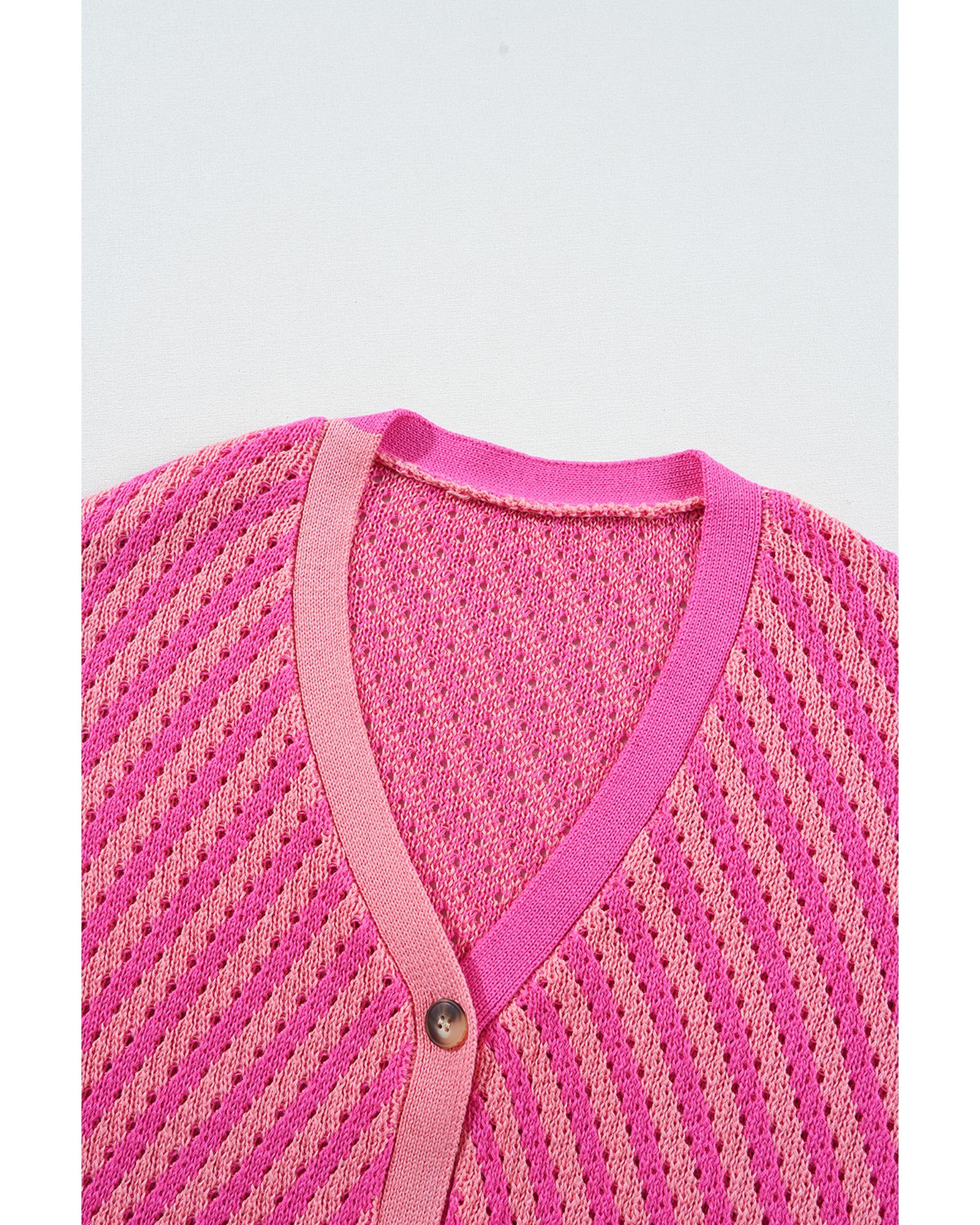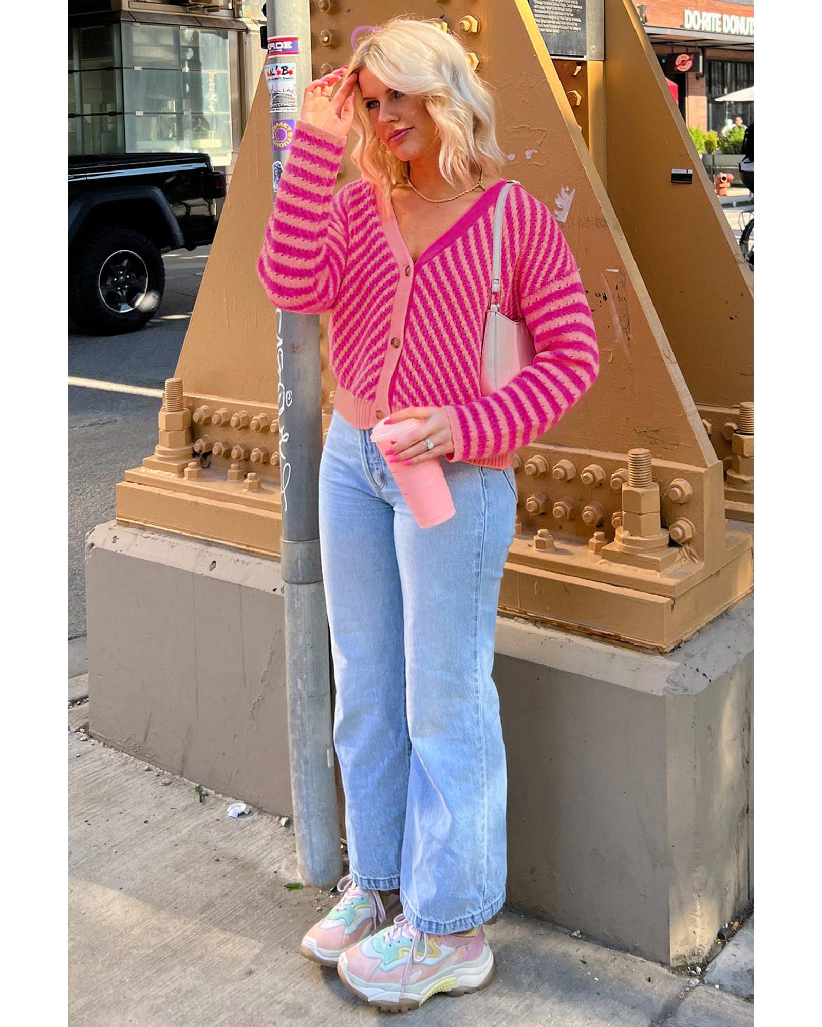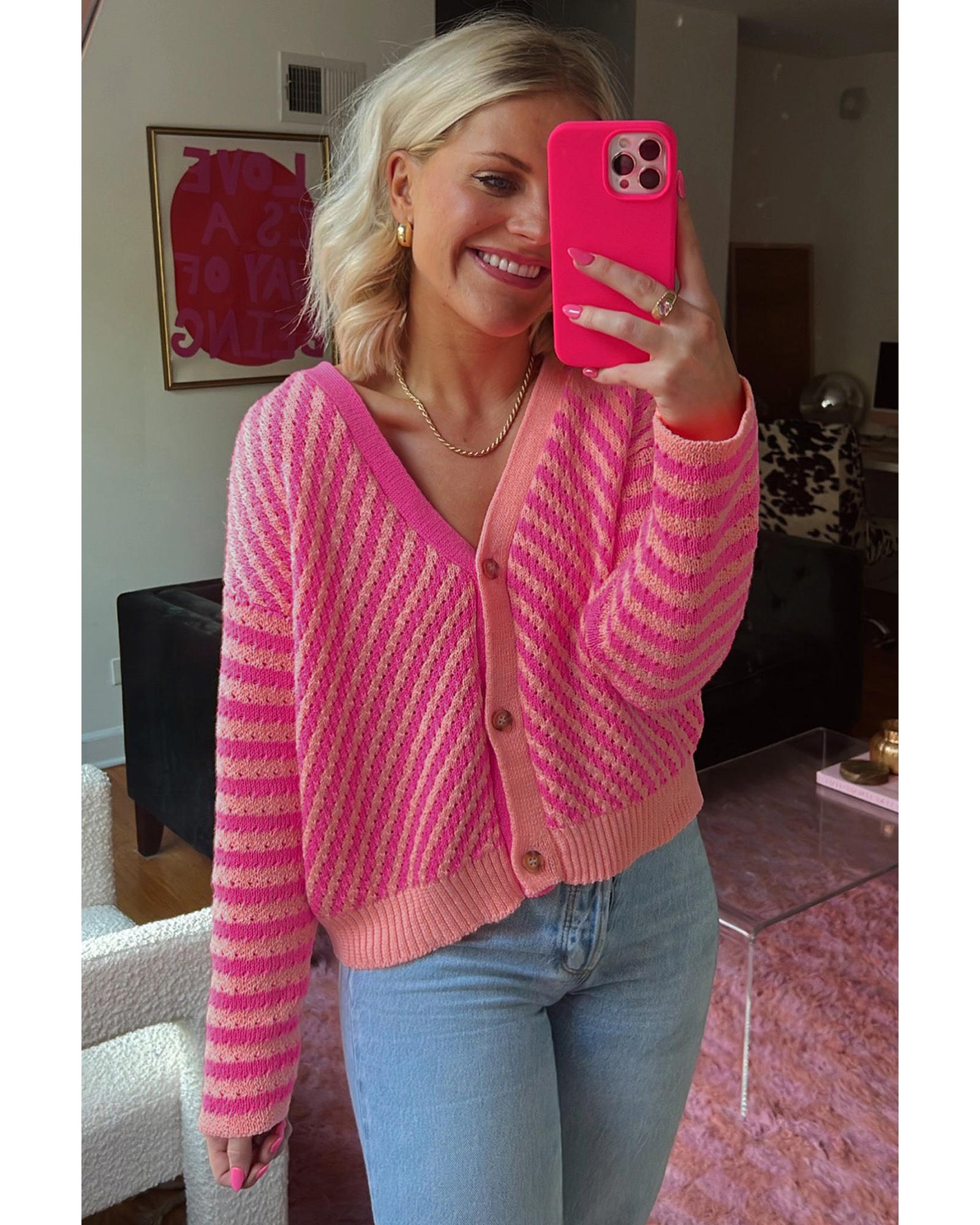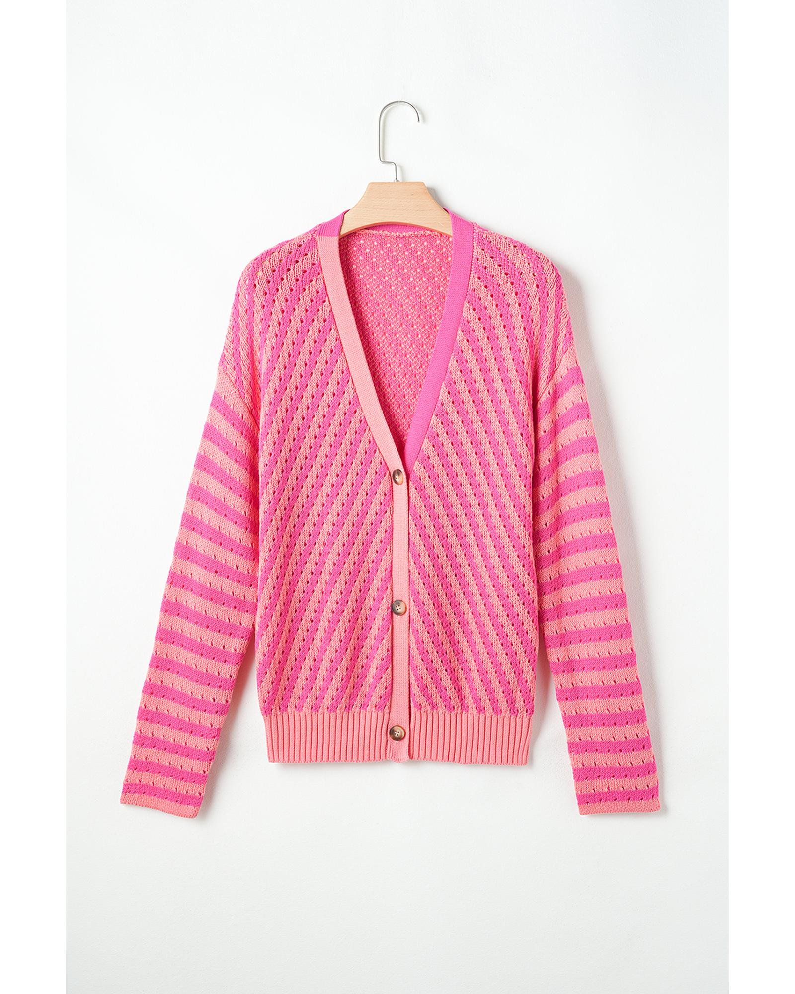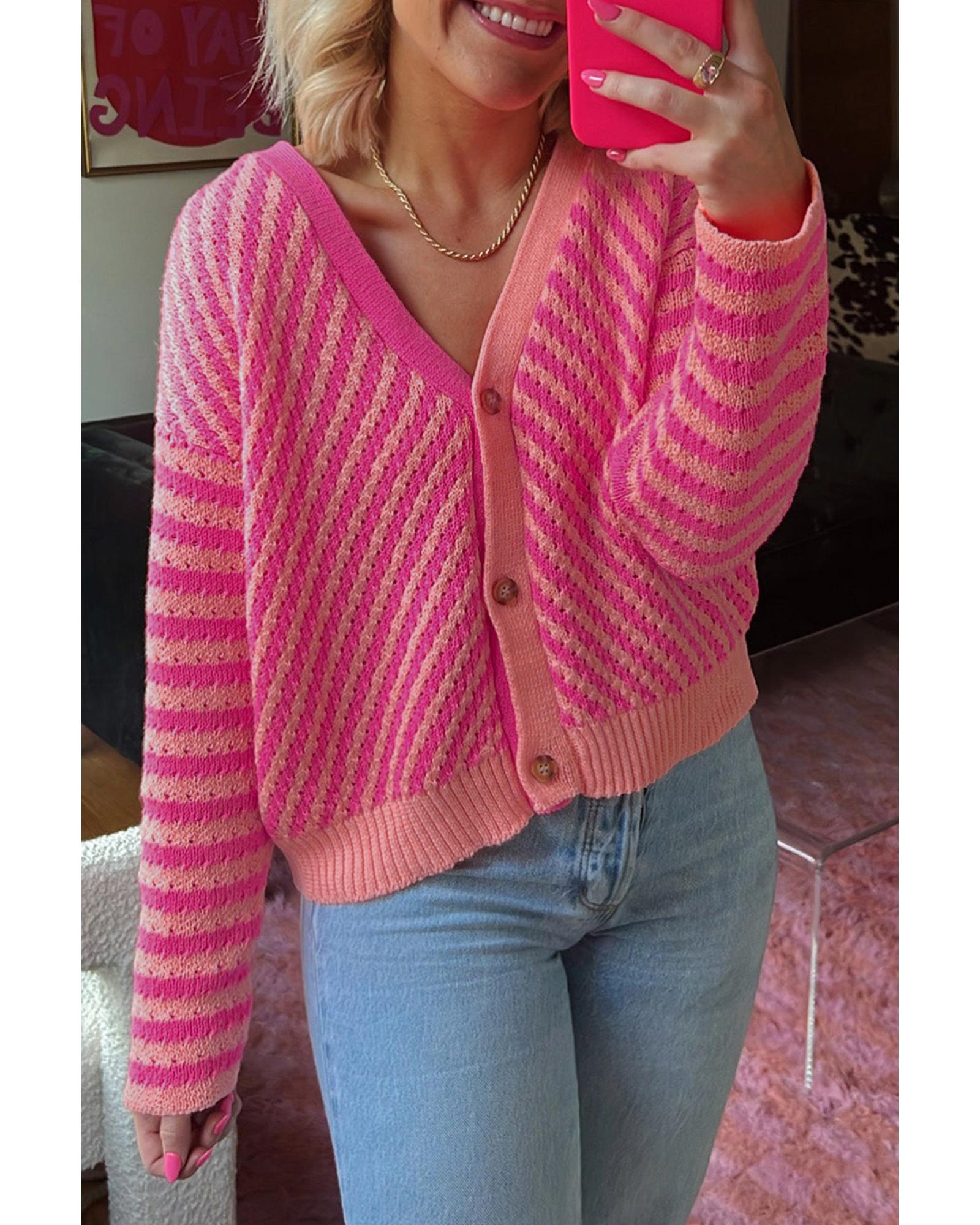 Pink Striped Buttoned V Neck Drop Shoulder Cardigan – L