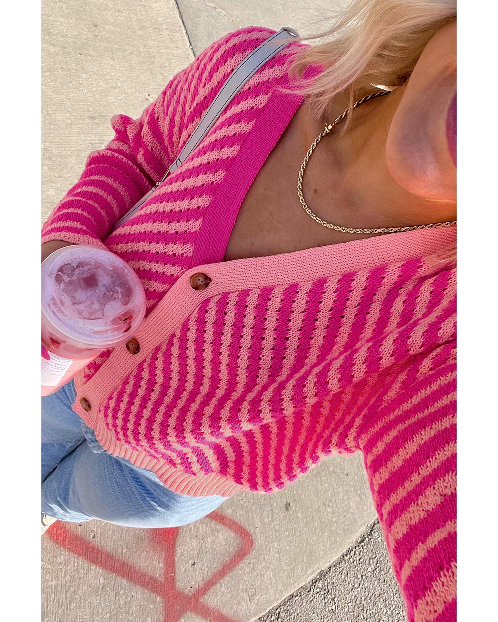 Pink Striped Buttoned V Neck Drop Shoulder Cardigan – M