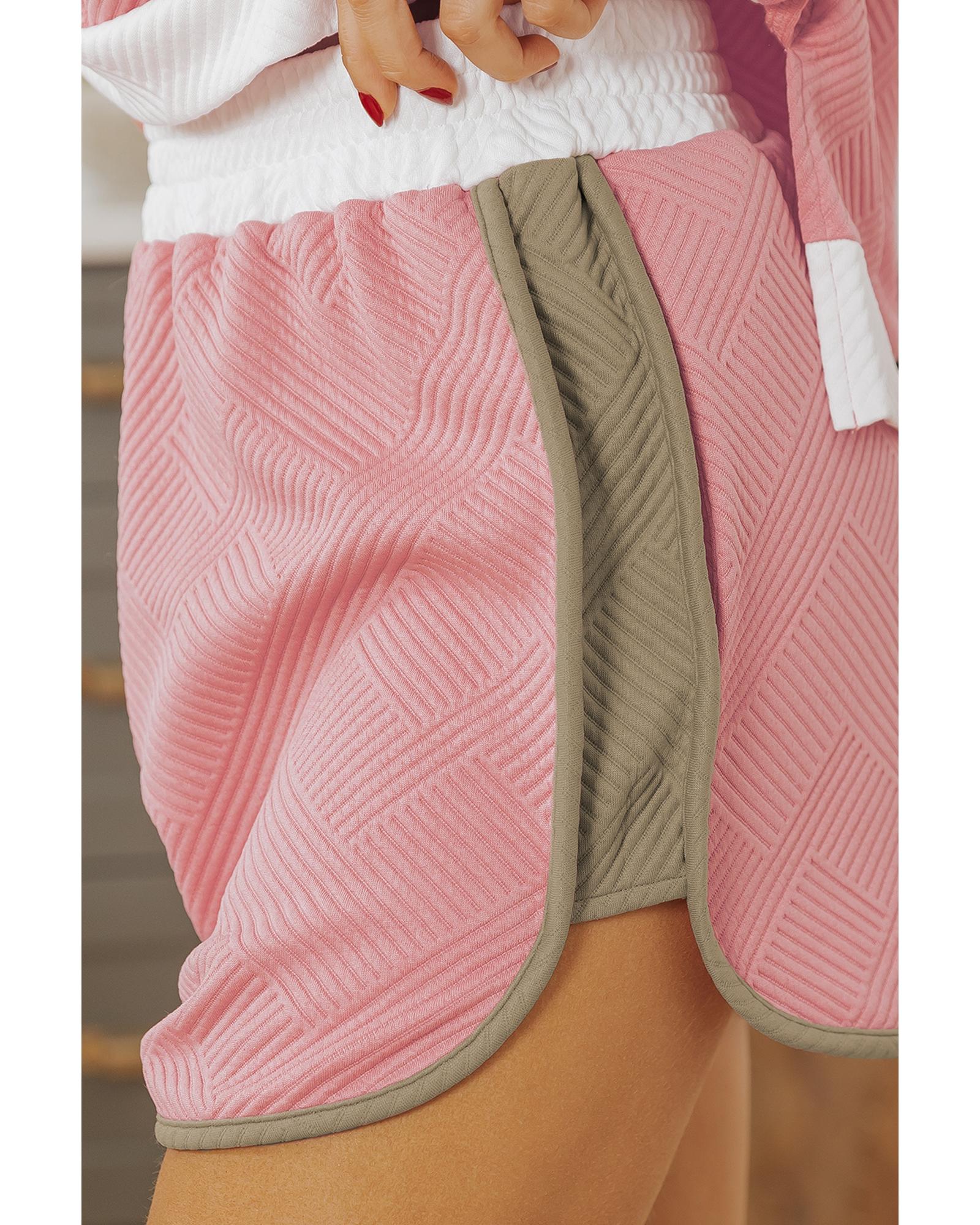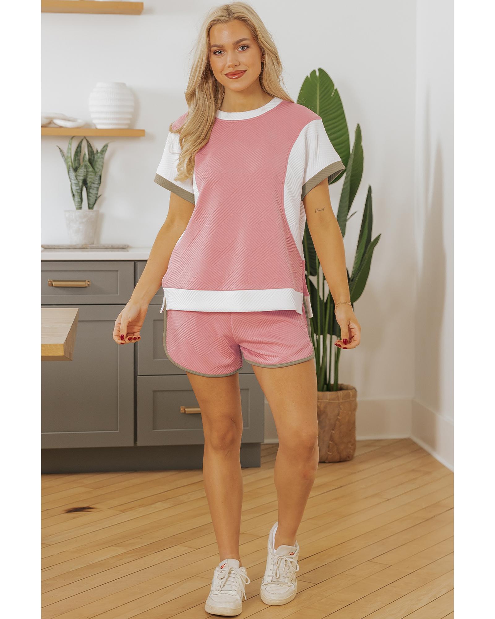 Pink Textured Colorblock Patchwork Tee Two Piece Shorts Set - S