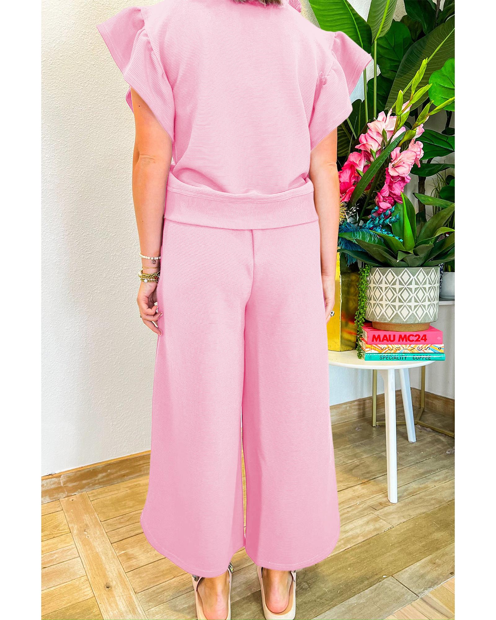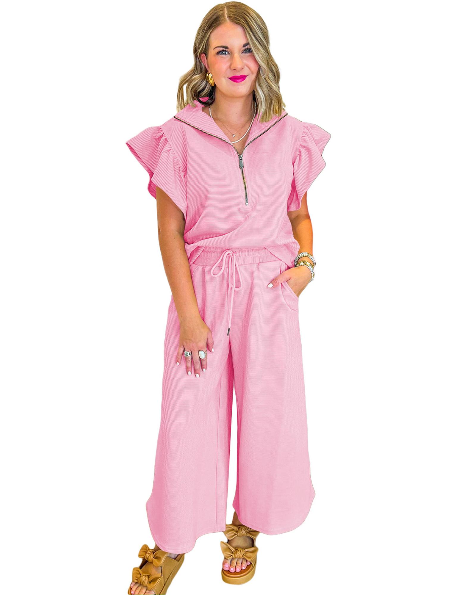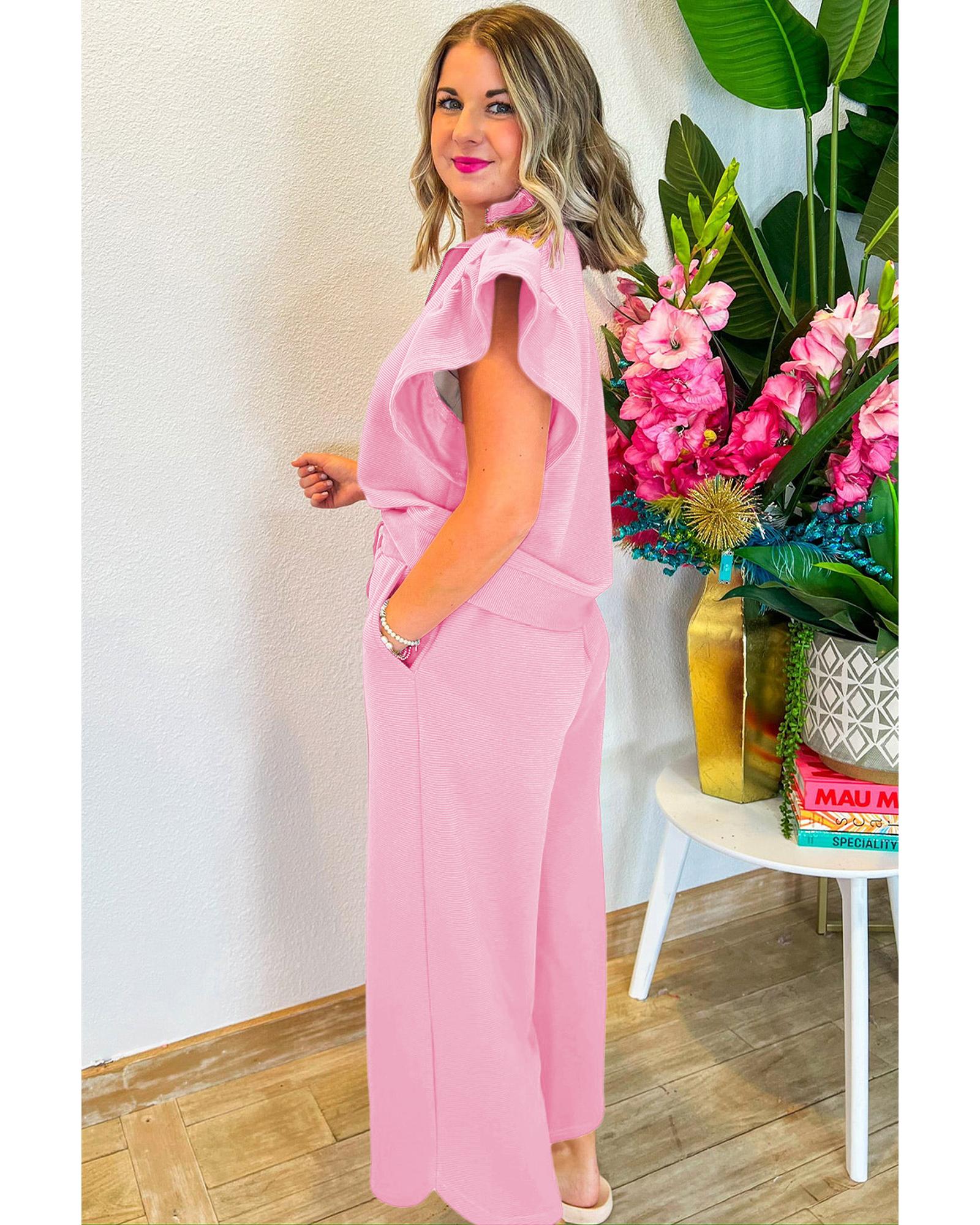 Pink Textured Ruffled Sleeve Zipped Top and Wide Leg Pants Set – S