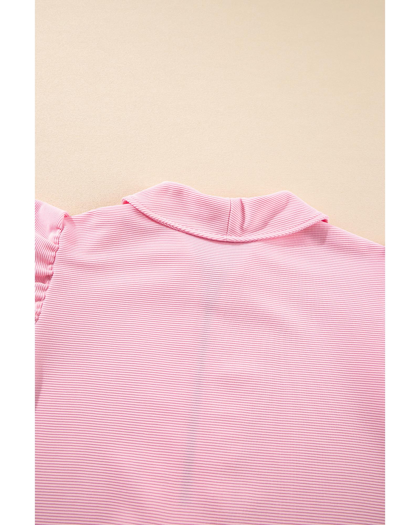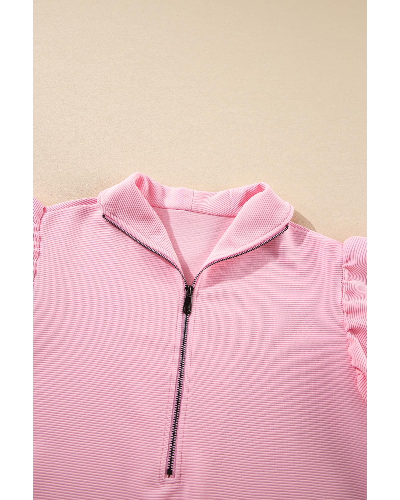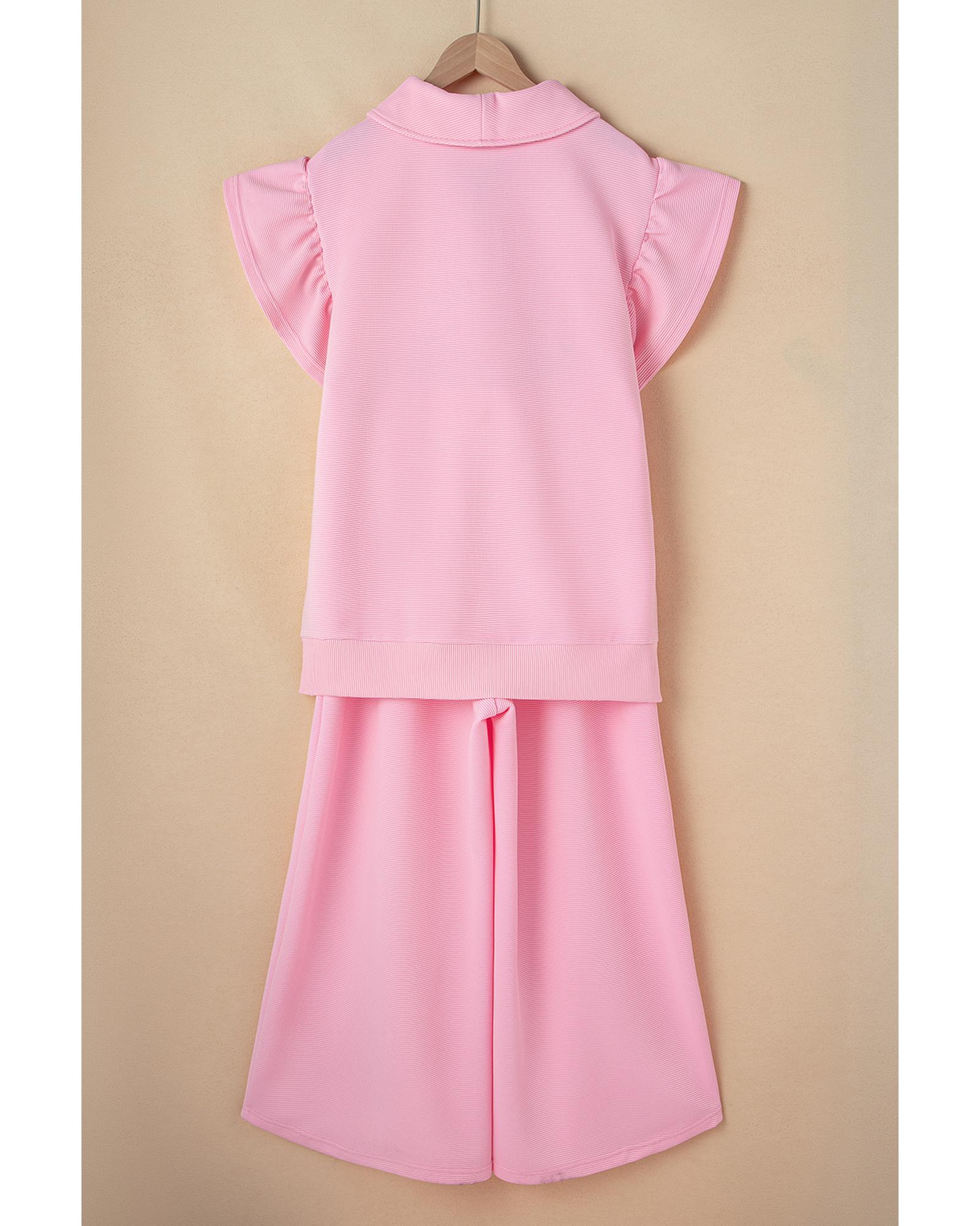 Pink Textured Ruffled Sleeve Zipped Top and Wide Leg Pants Set – S