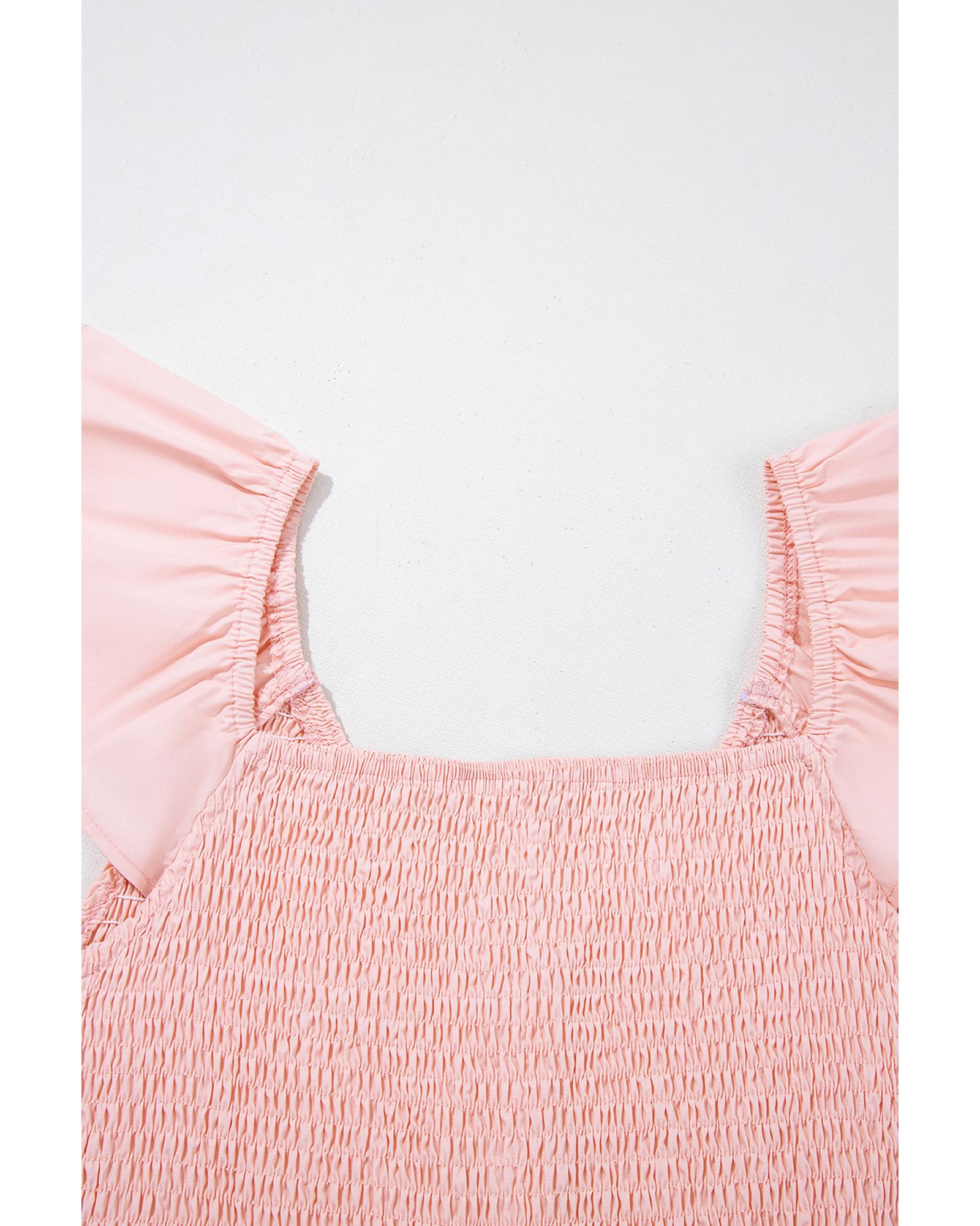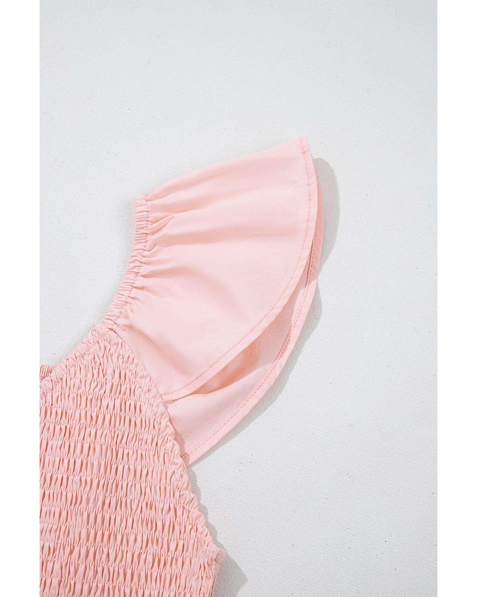 Pink V Neck Flutter Sleeve Smocked Bodice High Waist Ruffle Maxi Dress – L