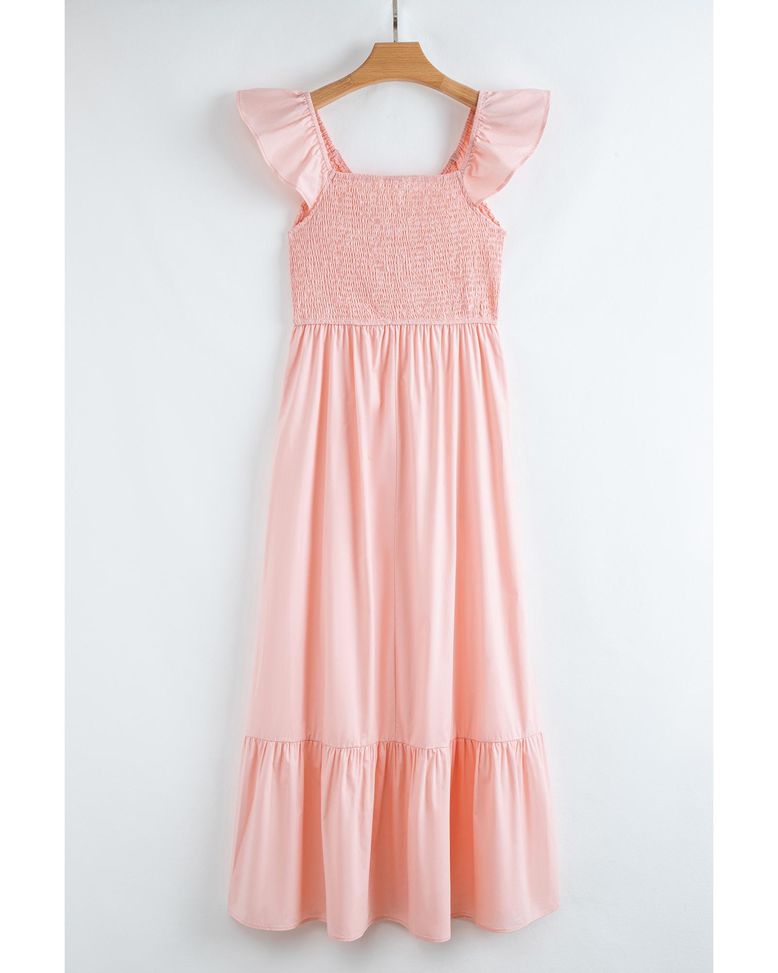 Pink V Neck Flutter Sleeve Smocked Bodice High Waist Ruffle Maxi Dress - S