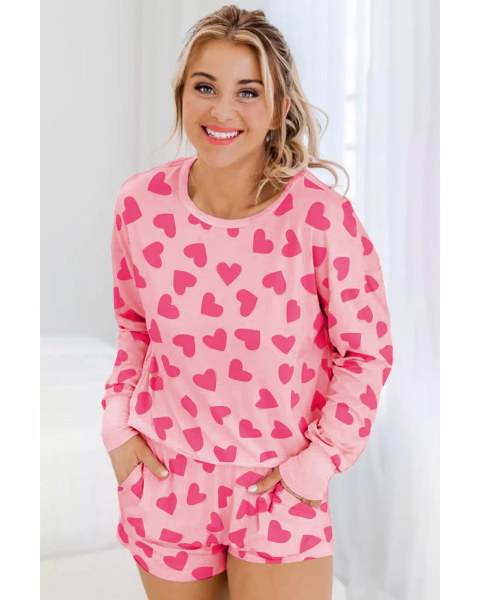 - Pink Valentine Heart Shape Print Long Sleeve Top Shorts Lounge Set