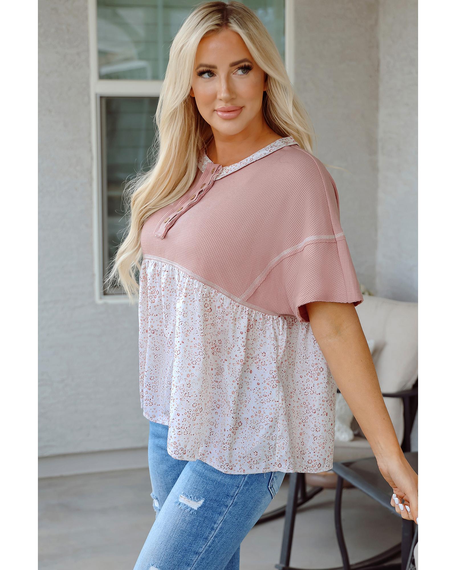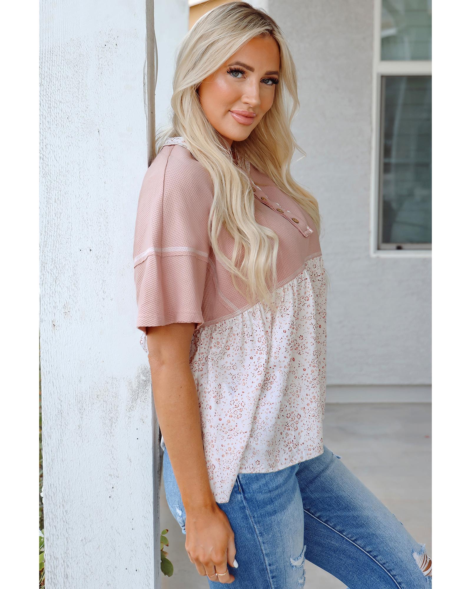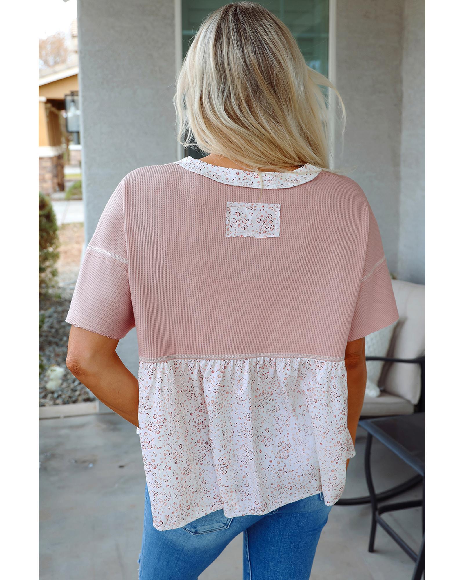 Pink Waffle Floral Patchwork Exposed Seam Detail Short Sleeve Top – L