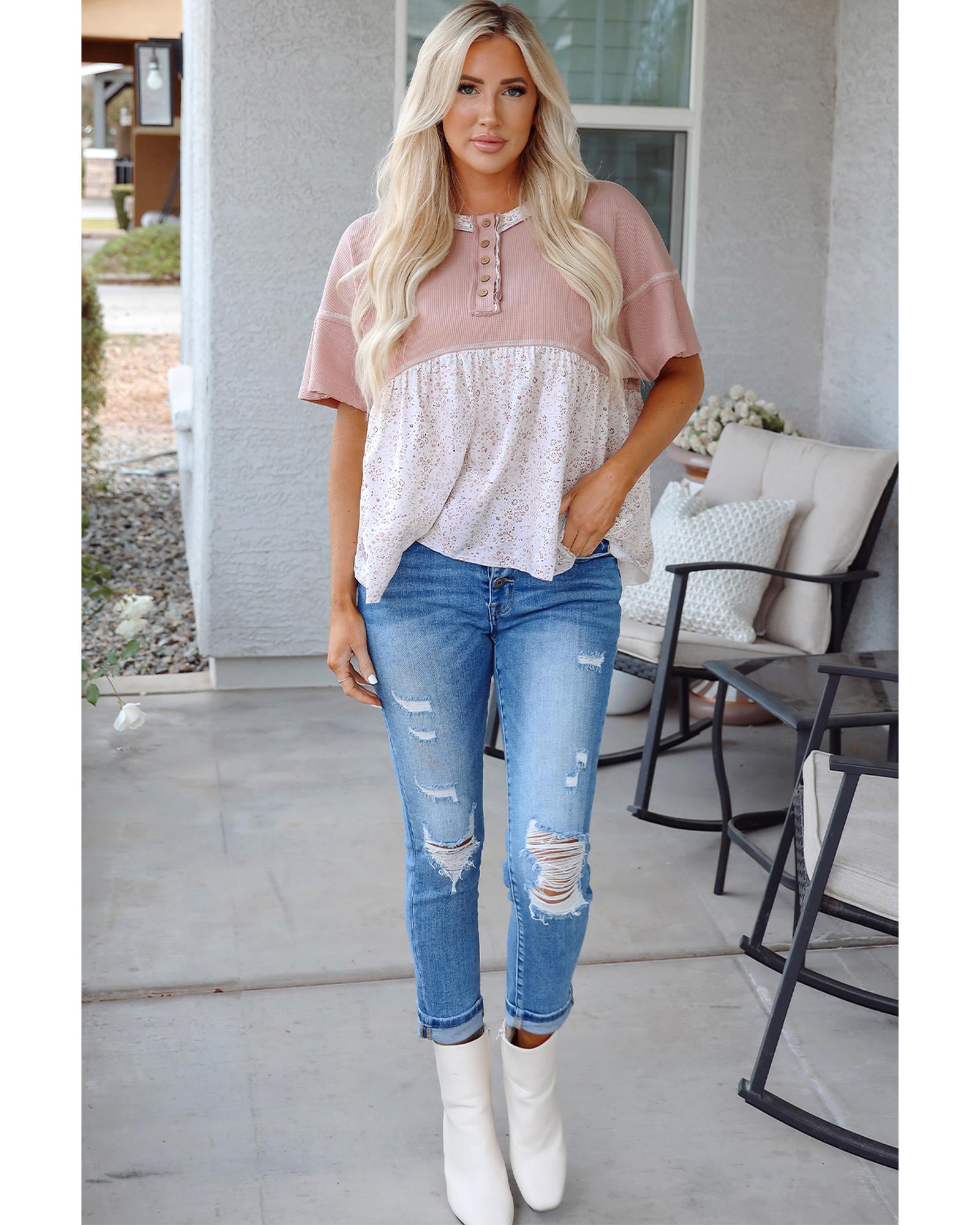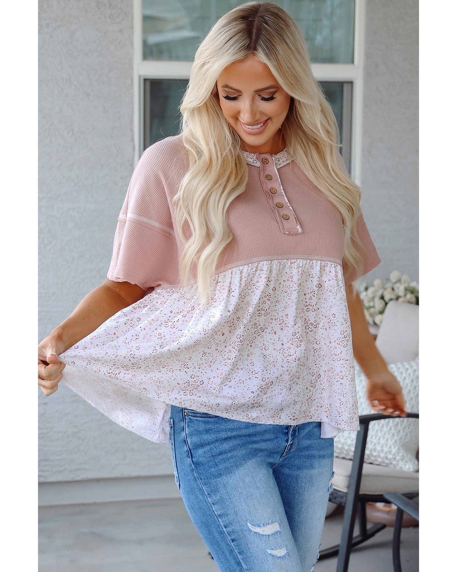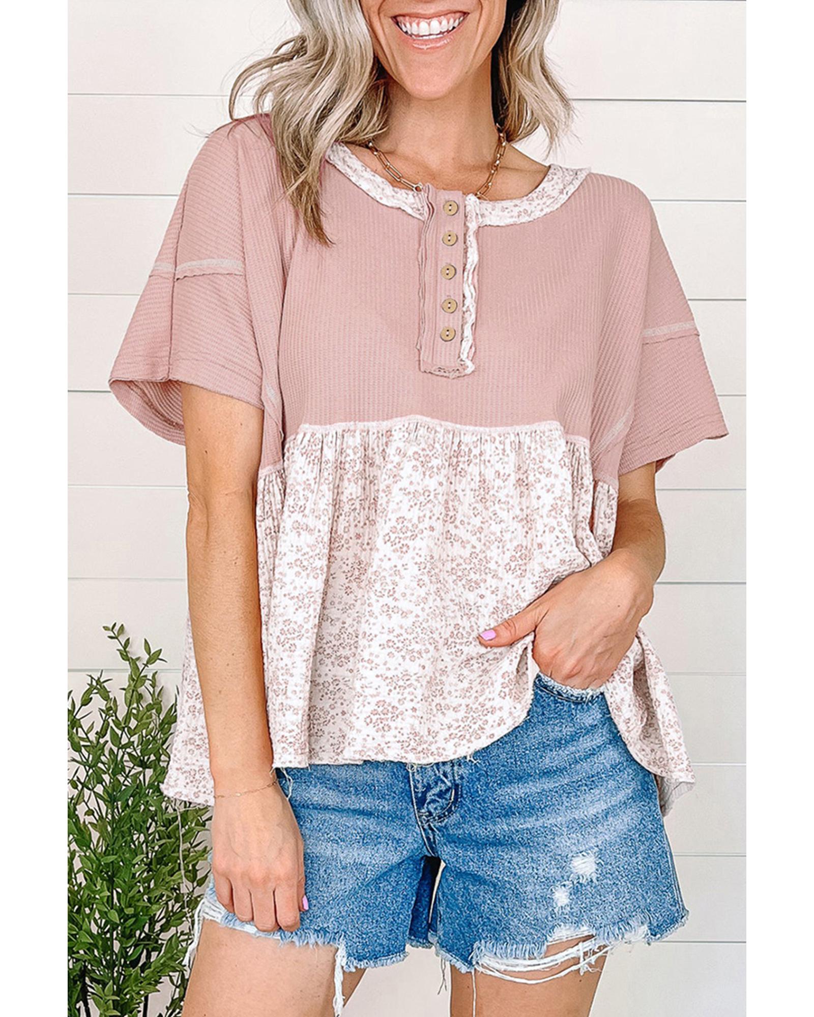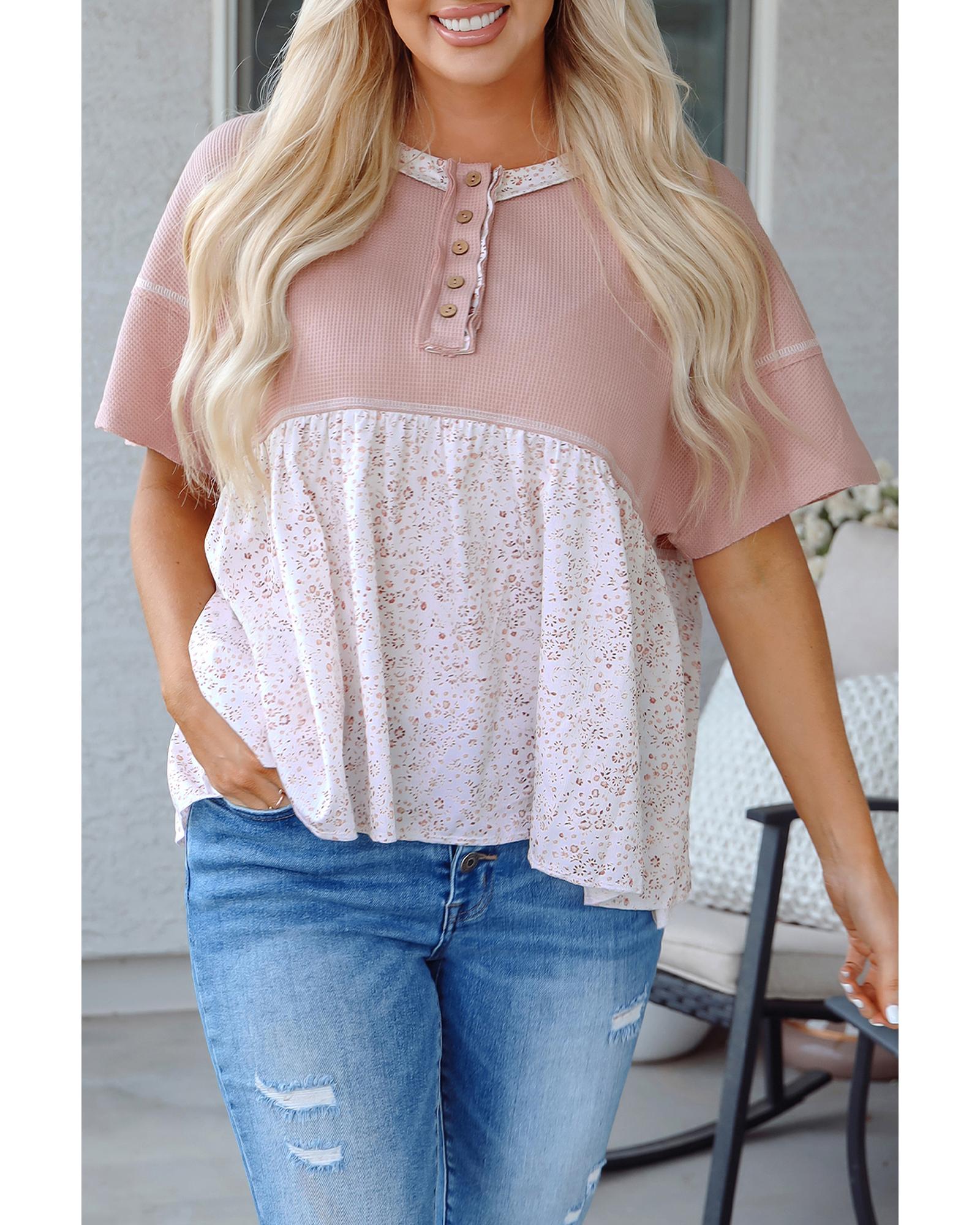 Pink Waffle Floral Patchwork Exposed Seam Detail Short Sleeve Top – L
