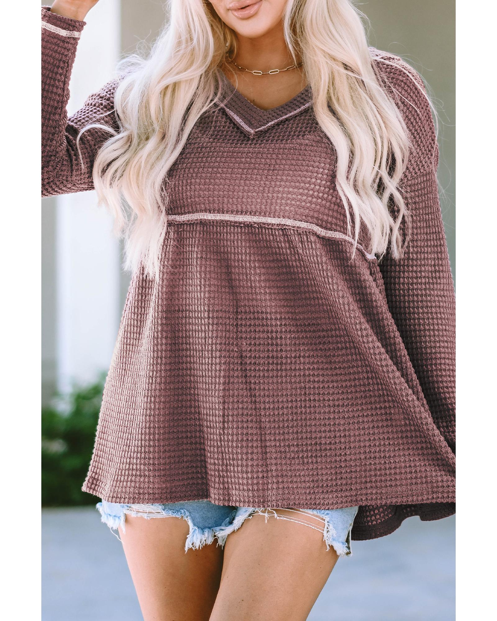 Pink Waffle Knit V Neck Long Sleeve Babydoll Top – M