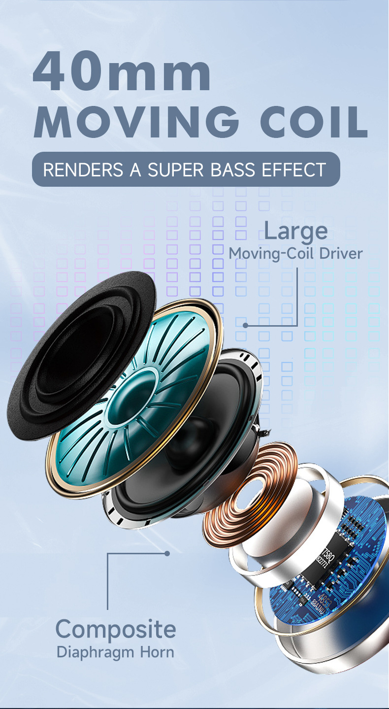 40mm Moving Coil Drivers: Delivers exceptional audio quality and super bass. Renders a super bass effect.