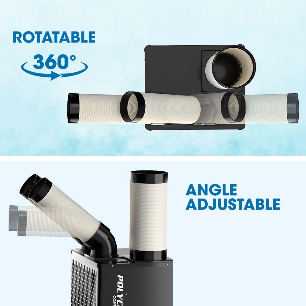 With 2 rotatable and angle adjustable ducts you can direct the powerful airflow to multiple workers or applications such as cooling equipment.