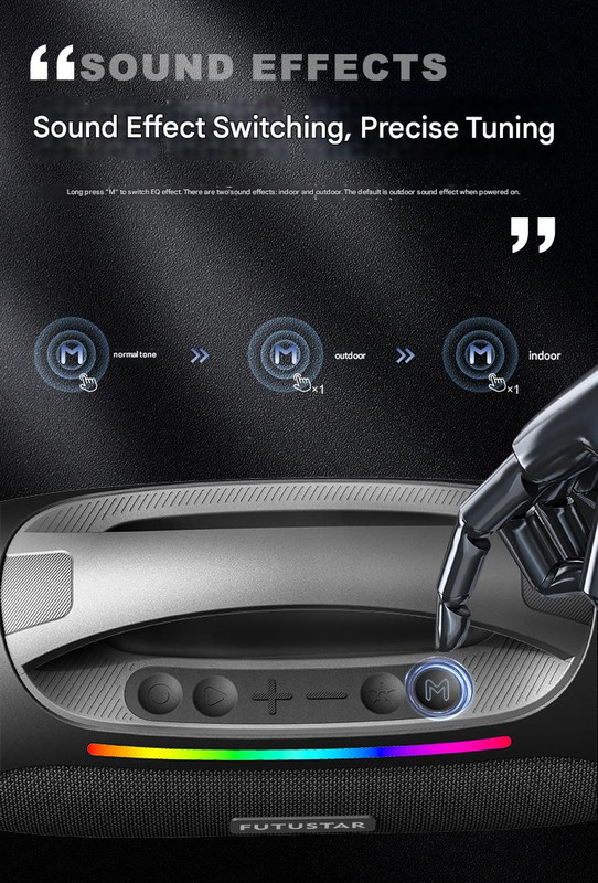 - Switchable EQ Sound Effects: Long press “M” button to toggle between indoor and outdoor sound profiles (defaults to outdoor on power-on).