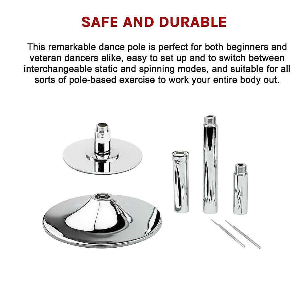 The pole is safe and reliable and will stand up to the test of time. Anti-slip silicone rubber is fitted on the base and extra-wide support dome. This pole will stand up to the most rugged workout and professional dancing routine. To make certain that your pole provides you with a smooth and quiet operation, a high density sealed bearing is a standard feature.