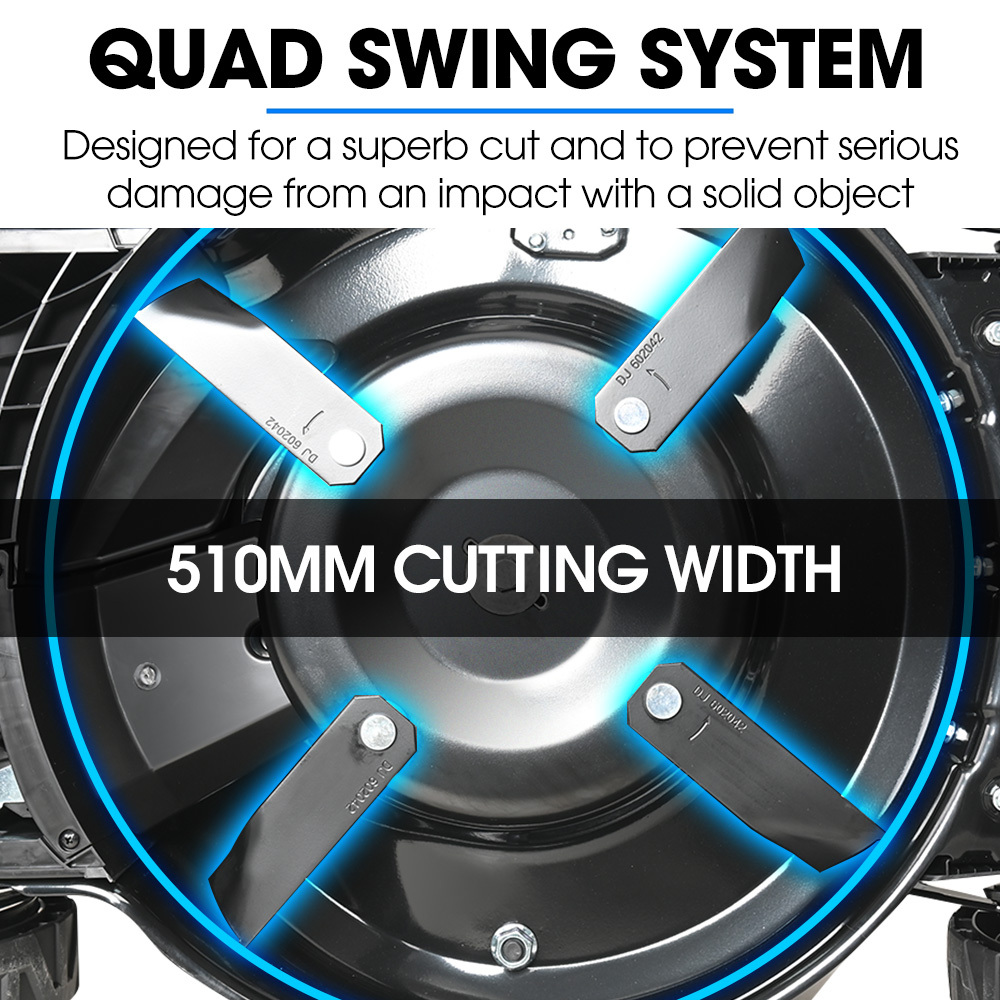 Navigate any terrain smoothly with oversized wheels and premium bearings, while the heavy-duty quad swing blade system ensures a precise 20-inch cut. The swing blades are designed to protect the shaft in the event of a solid object being hit. The generous 60L catcher means fewer stops and more continuous mowing.