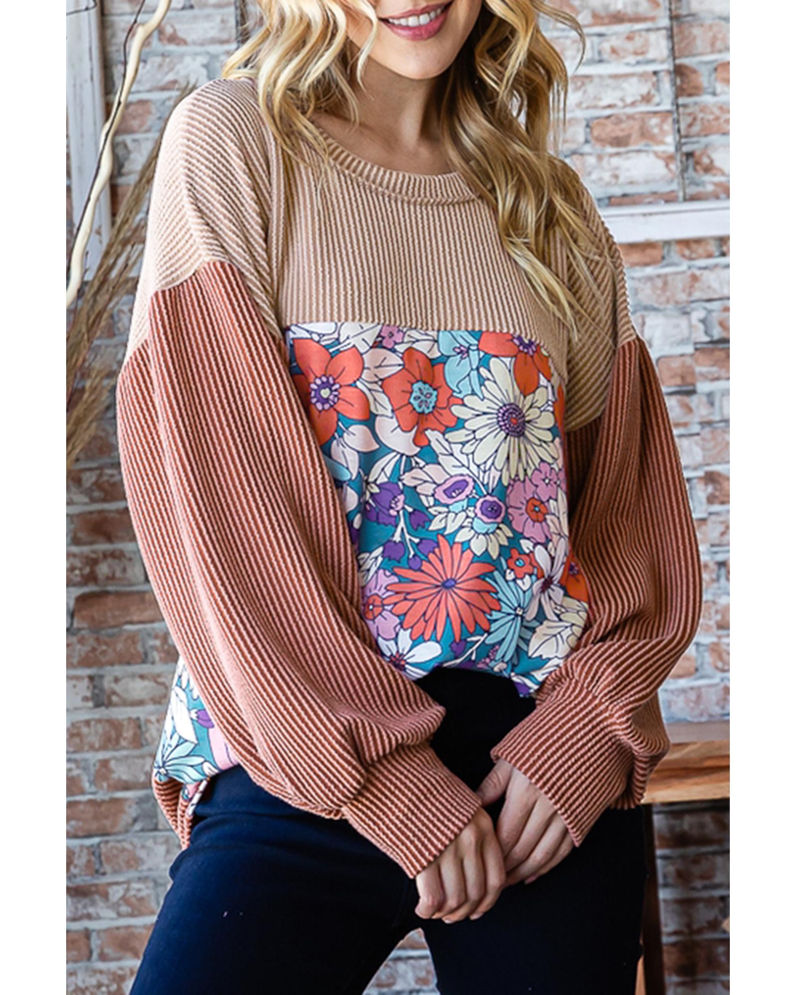 Printed Floral Contrast Colorblock Ribbed Top – XL