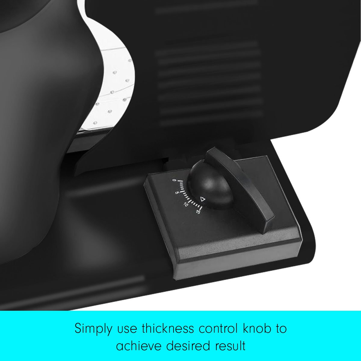 The adjustable thickness dial allows you to slice foods to a variety of thicknesses, from 1mm to 15mm, while the safety food holder holds food pieces in place while slicing, and ensures fingers are kept well away from the blade.