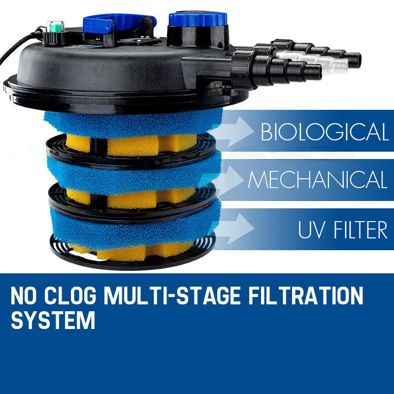 - STAGE 1 – MECHANICAL FILTRATION – Water is pumped into the filter (pump sold separately) to create the necessary pressure to begin the mechanical filtration stage. Three foam discs collect various sizes of unwanted organic debris encouraging the growth of large numbers of beneficial bacteria which break down harmful pollutants.