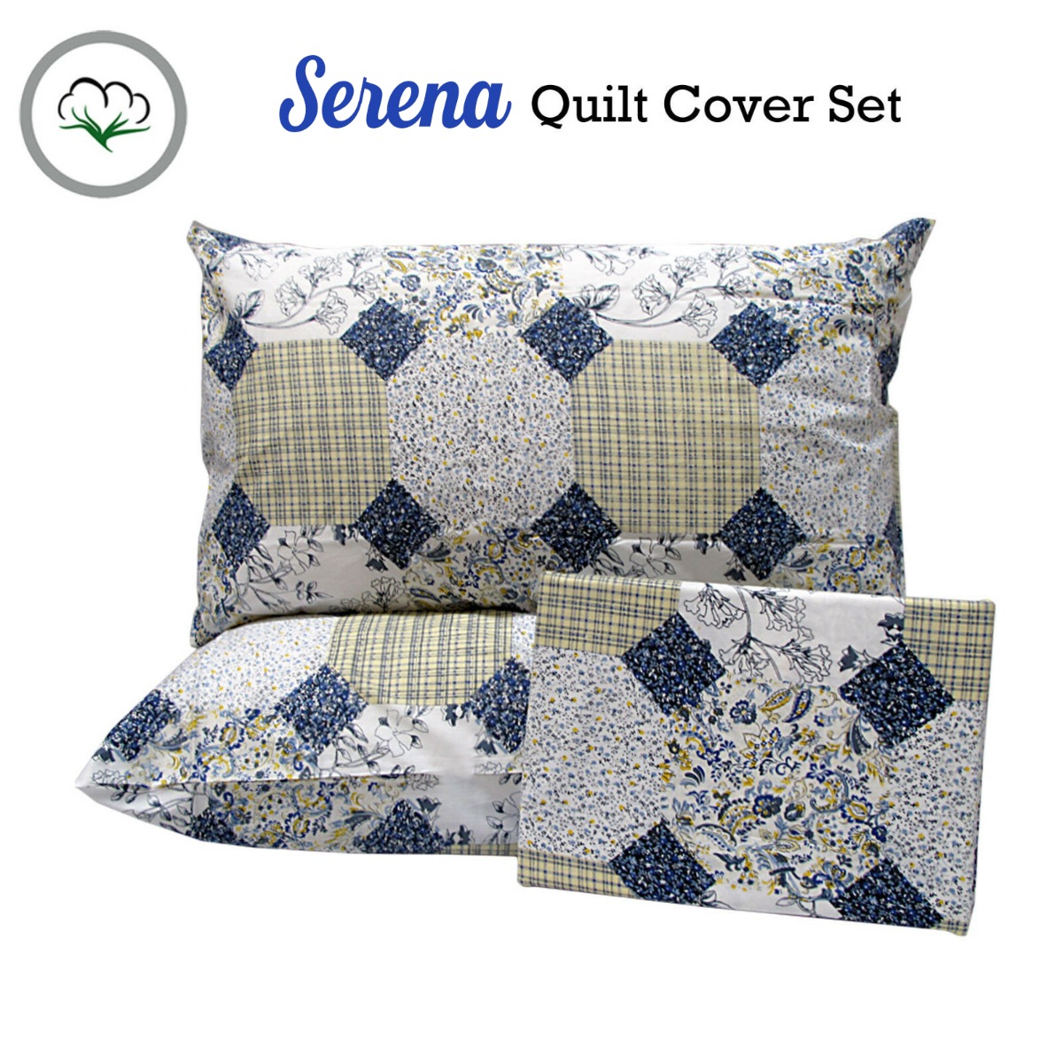 Give your bedroom an instant face-lift to make it look more inviting with this 3 Pce Serena 100% Cotton Quilt Cover Set. This quilt cover features geometric and damask pattern printed in blue, yellow, navy, and white colour tones that will instantly rejuvenate the atmosphere of any room. A lovely set made from quality and soft touch 100% Cotton fabric with softness you can enjoy all night long.
