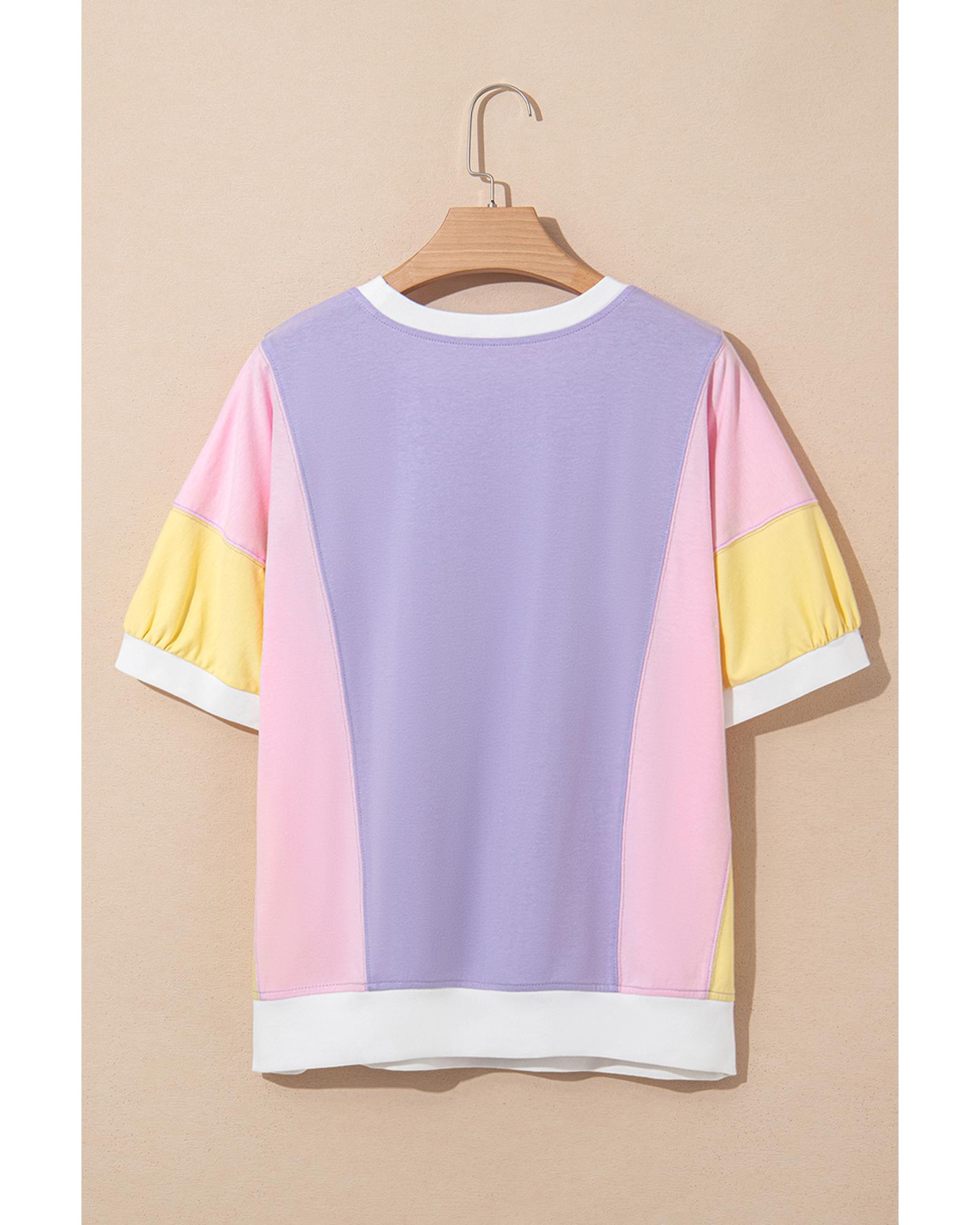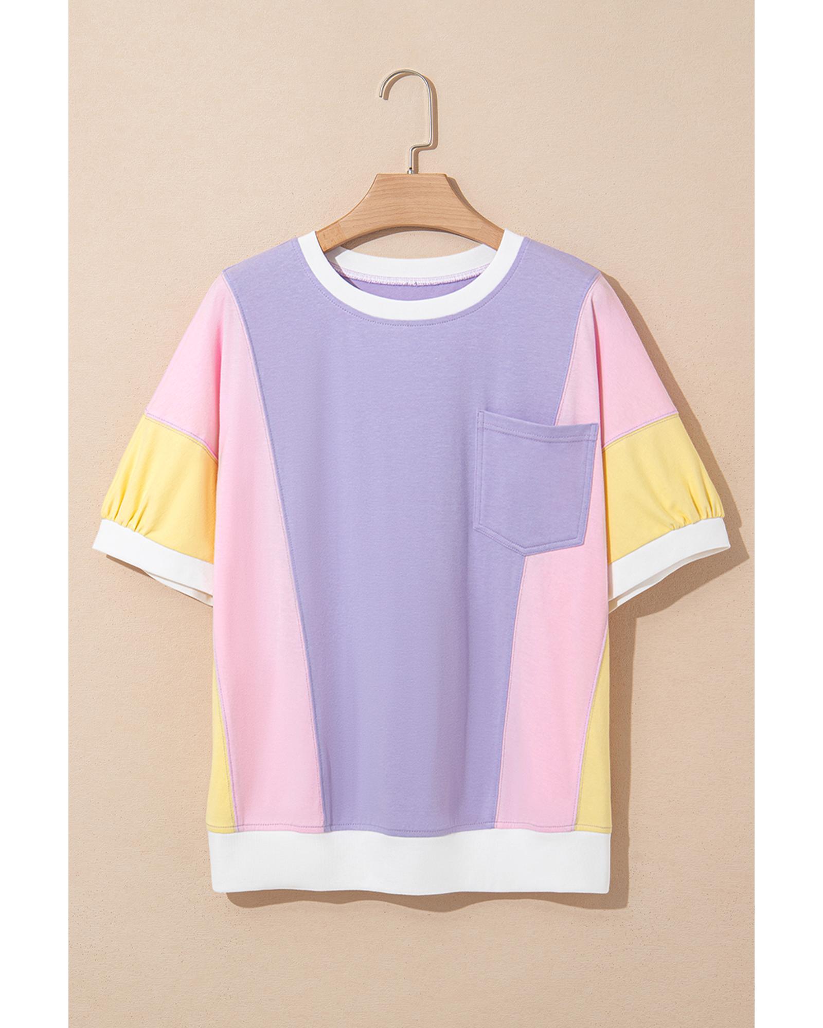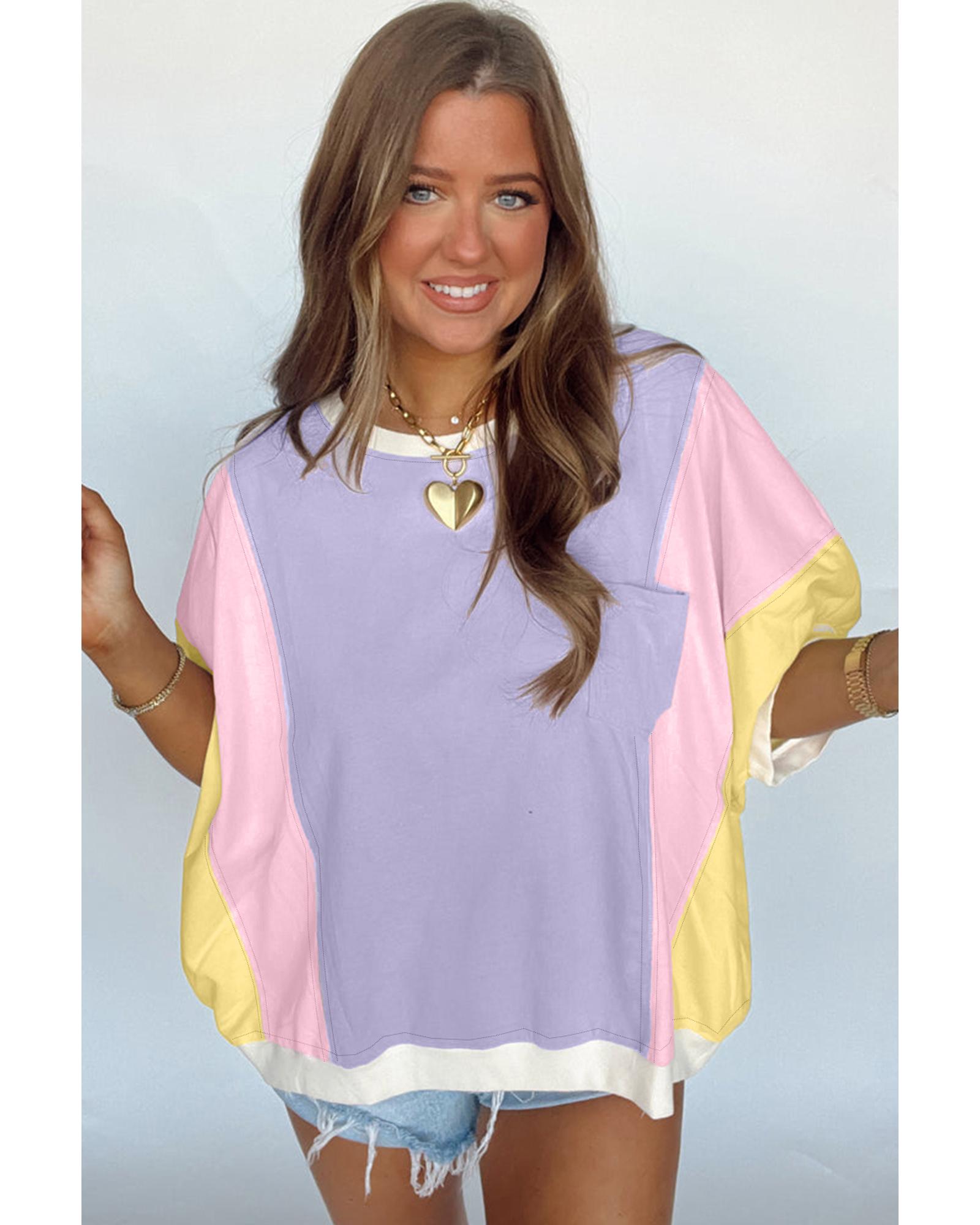 Purple Color Block Patchwork Half Sleeve Oversized T Shirt – XL