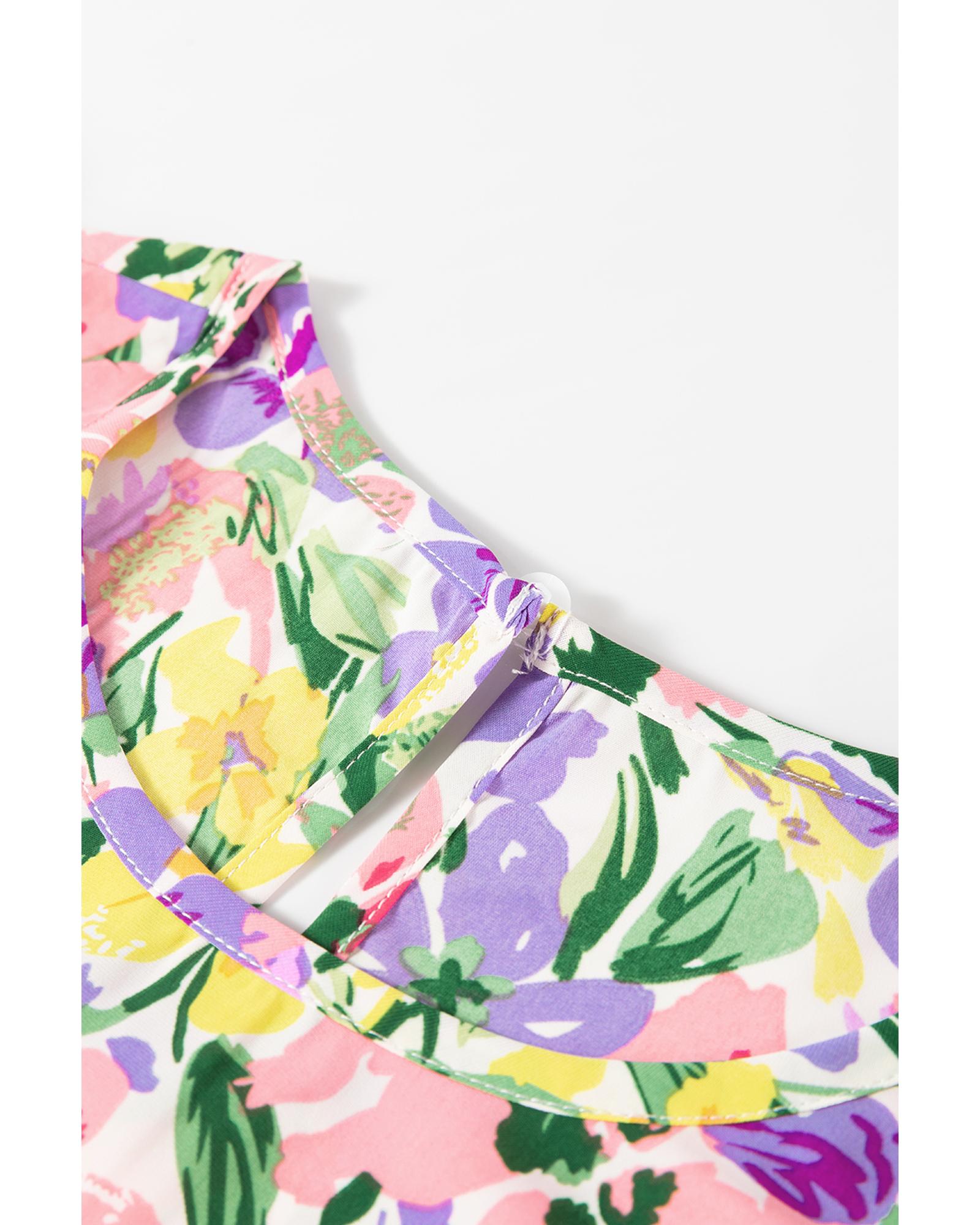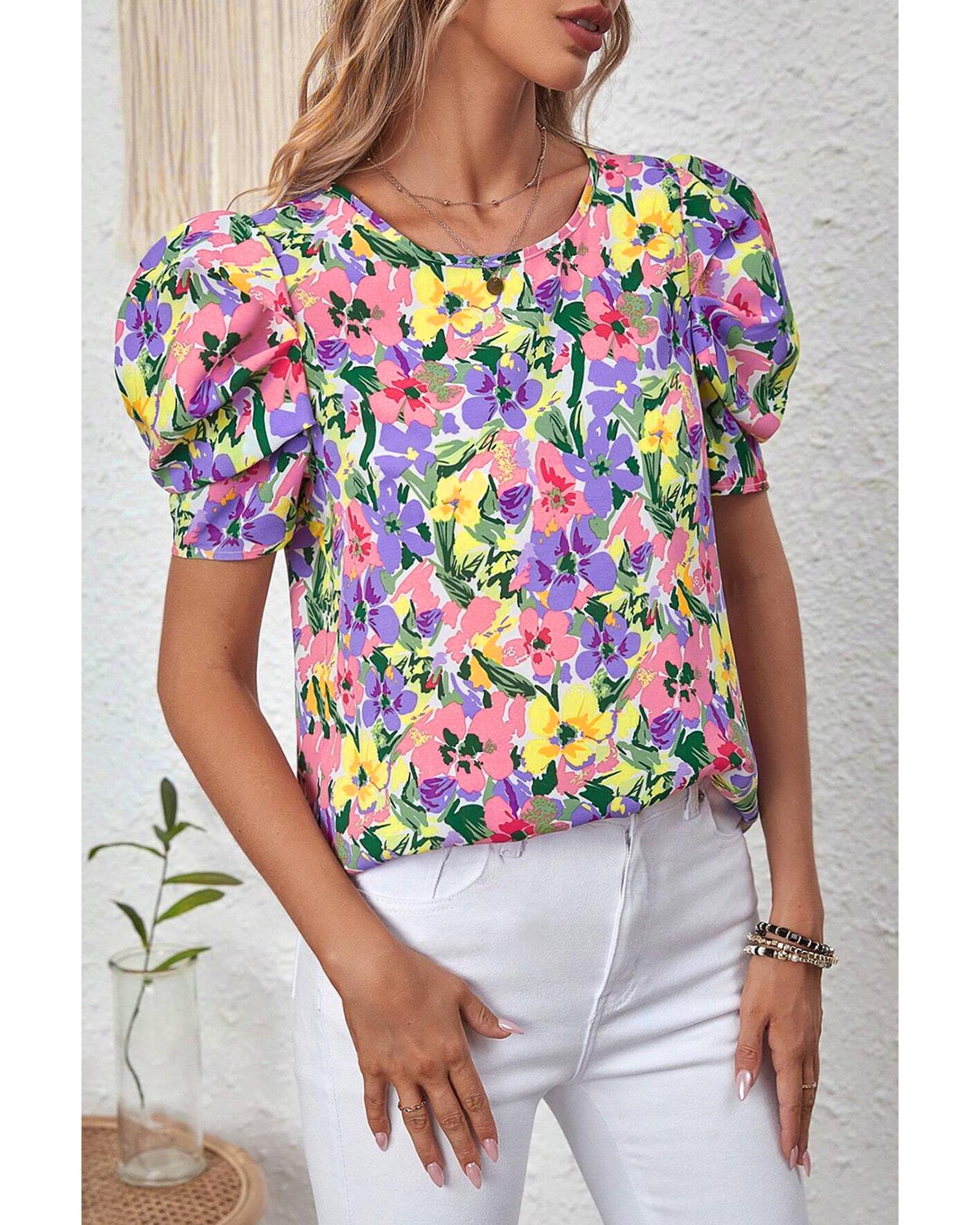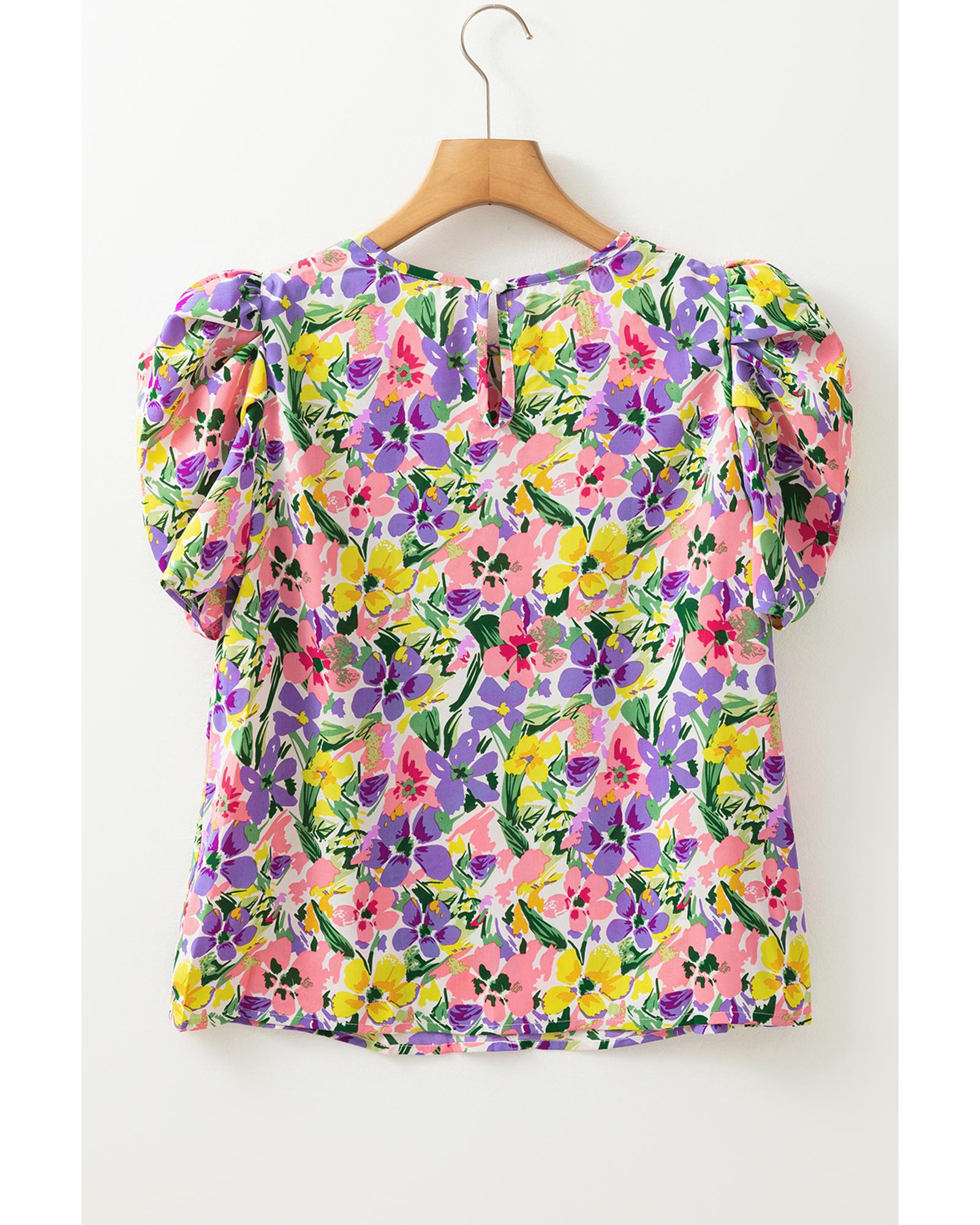Purple Floral Print Puff Short Sleeve Crew Neck Blouse – XL